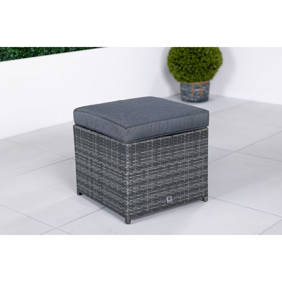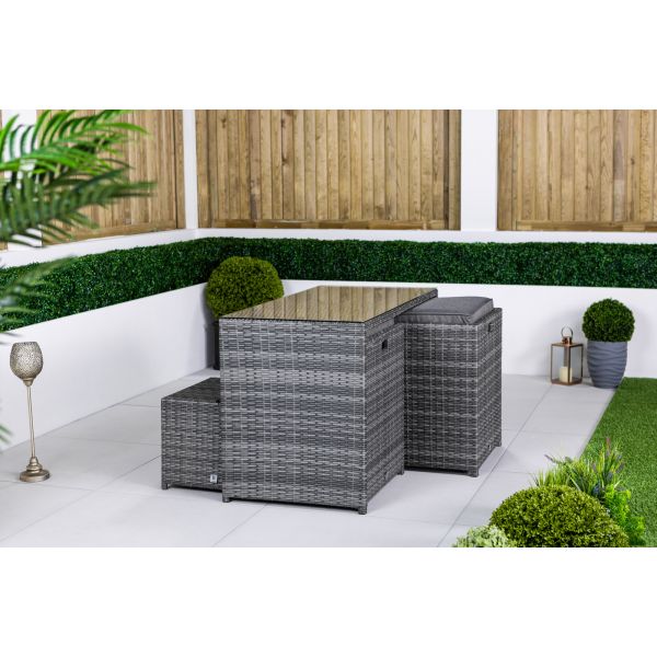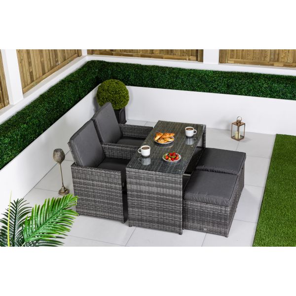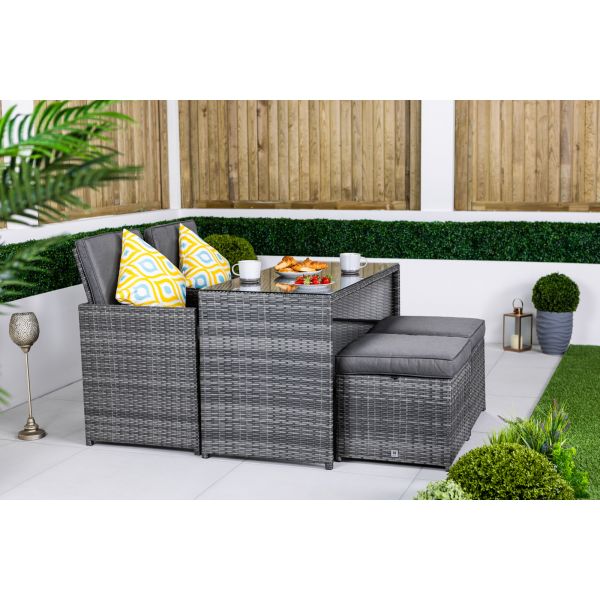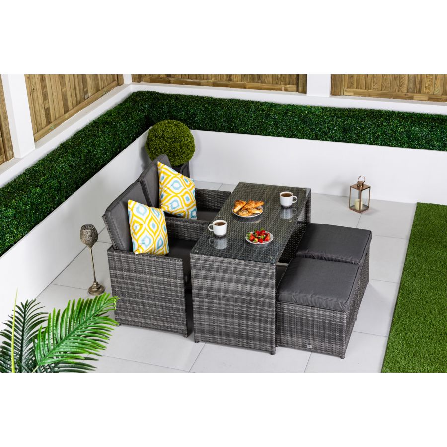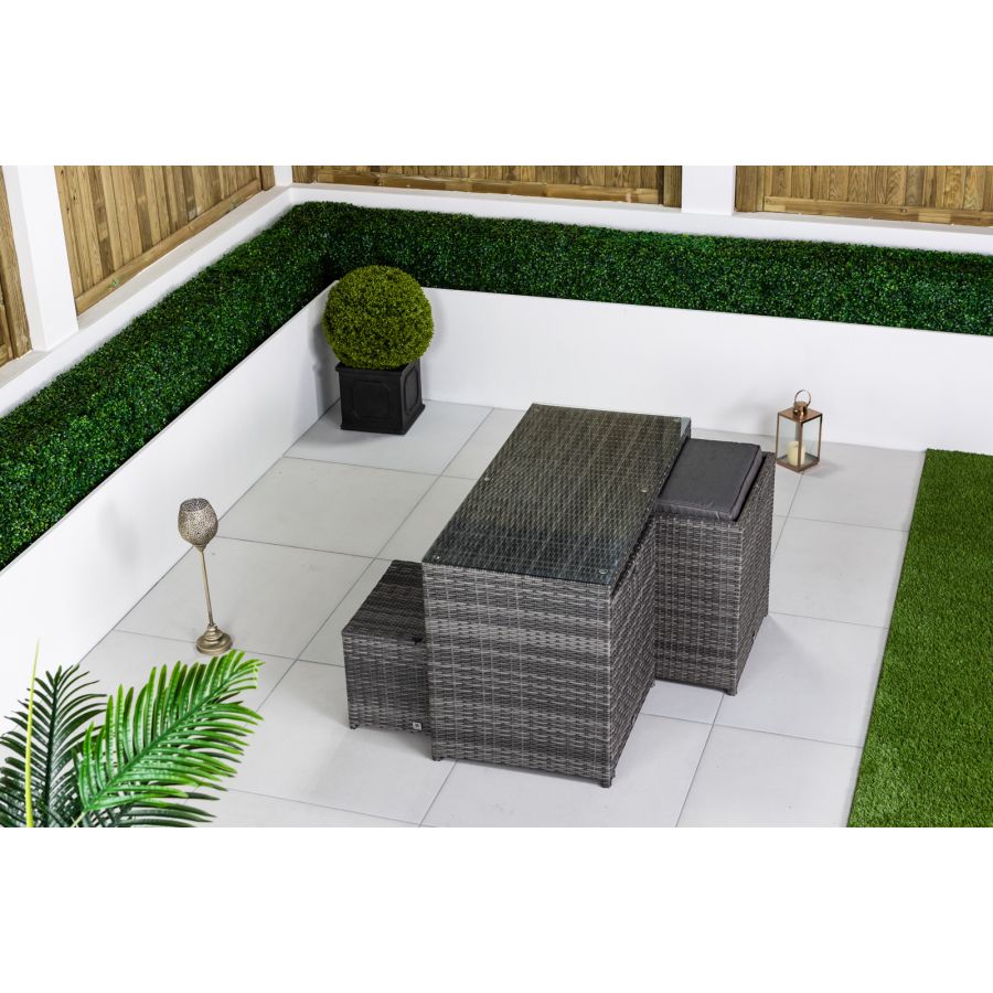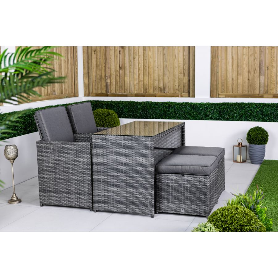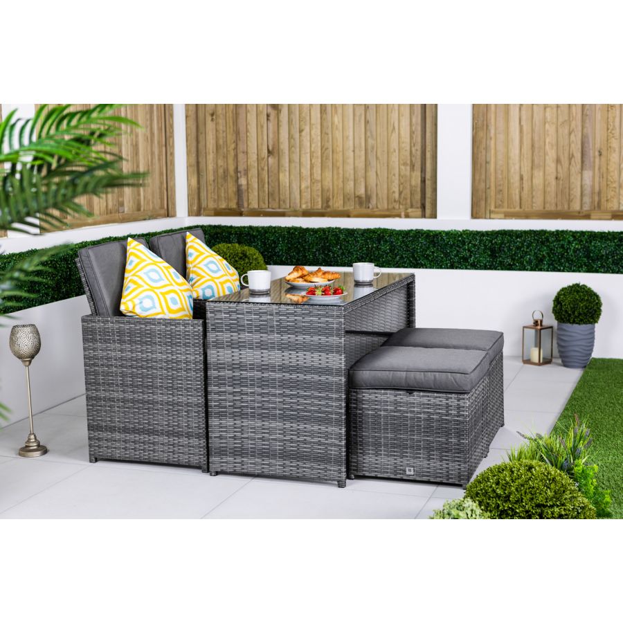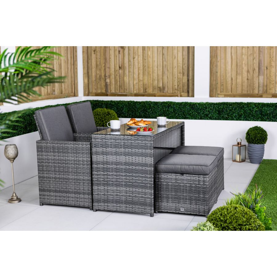 Ideal for small balconies, patios, and terraces, the Giardino 2 seater cube garden furniture set offers a stylish and space-saving solution for outdoor relaxation. This versatile grey rattan bistro set comfortably seats up to four people with its 120cm x 60cm bistro table, two cushioned cube chairs, and two plush padded stools. When not in use, the chairs and stools neatly tuck away under the table, maximizing your precious outdoor space.