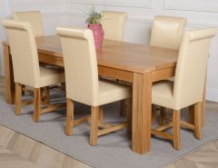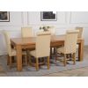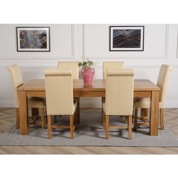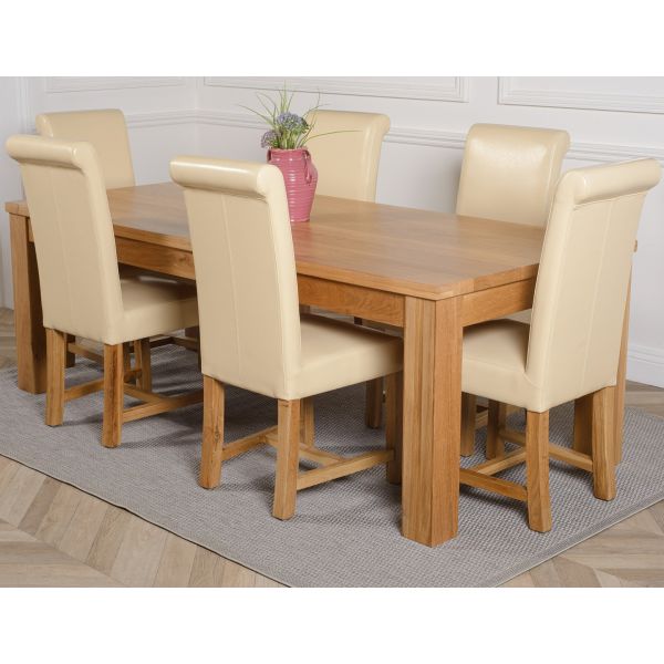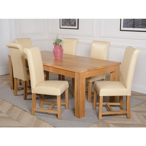 This dinner table and chairs set comes with 6 Washington dining chairs upholstered in ivory bonded leather with solid oak legs, hardwood frame and a sprung seat for exceptional comfort and durability.