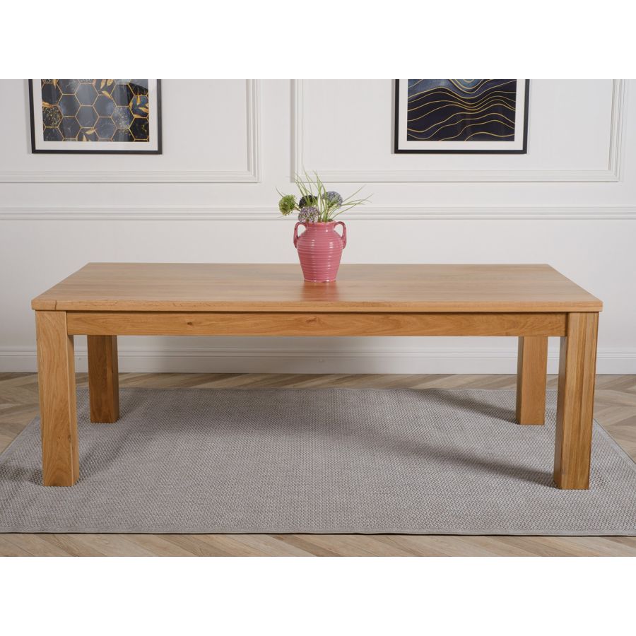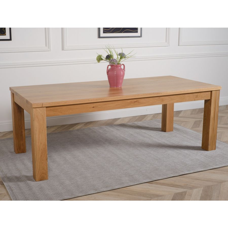 Featuring a distinct thick cut table top with chunky robust square set legs the Dakota extra large oak dining table has a solid look and feel. Standing at a height of 77 cm with a 222 x 102 cm table top made from thick cuts of full length solid oak timber, the Dakota is easy to clean with a damp cloth making this low maintenance solid oak dining table and chairs set 6 ideal for everyday use.