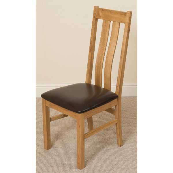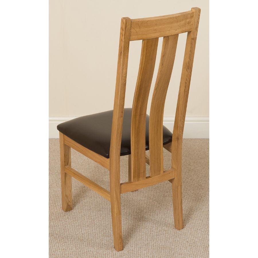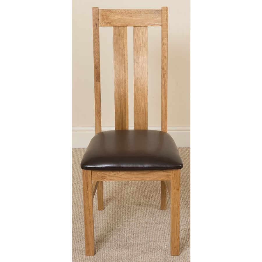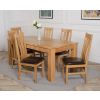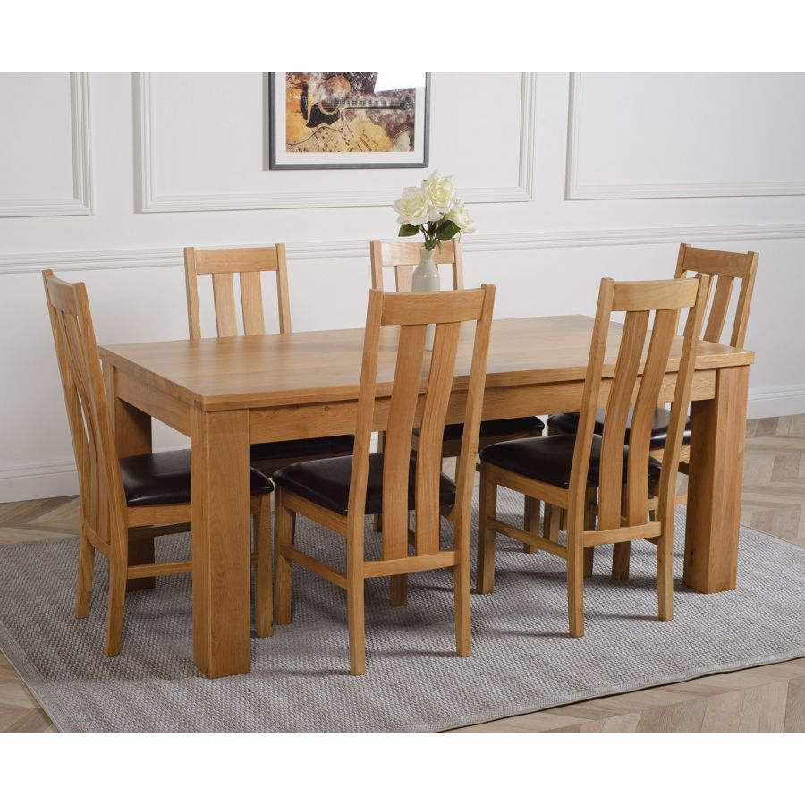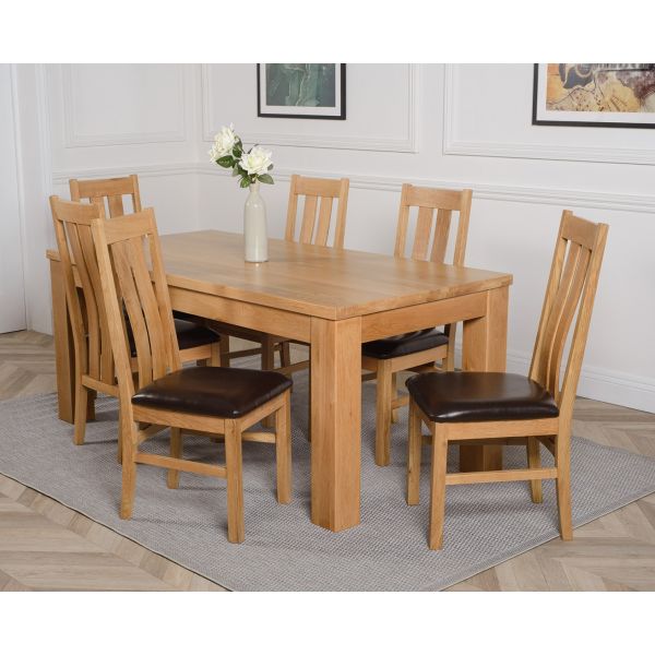 This dinner table and chairs set comes complete with 6 fully assembled Princeton arched back oak dining chairs made from solid oak with padded seats upholstered in brown bonded leather.