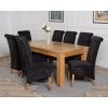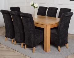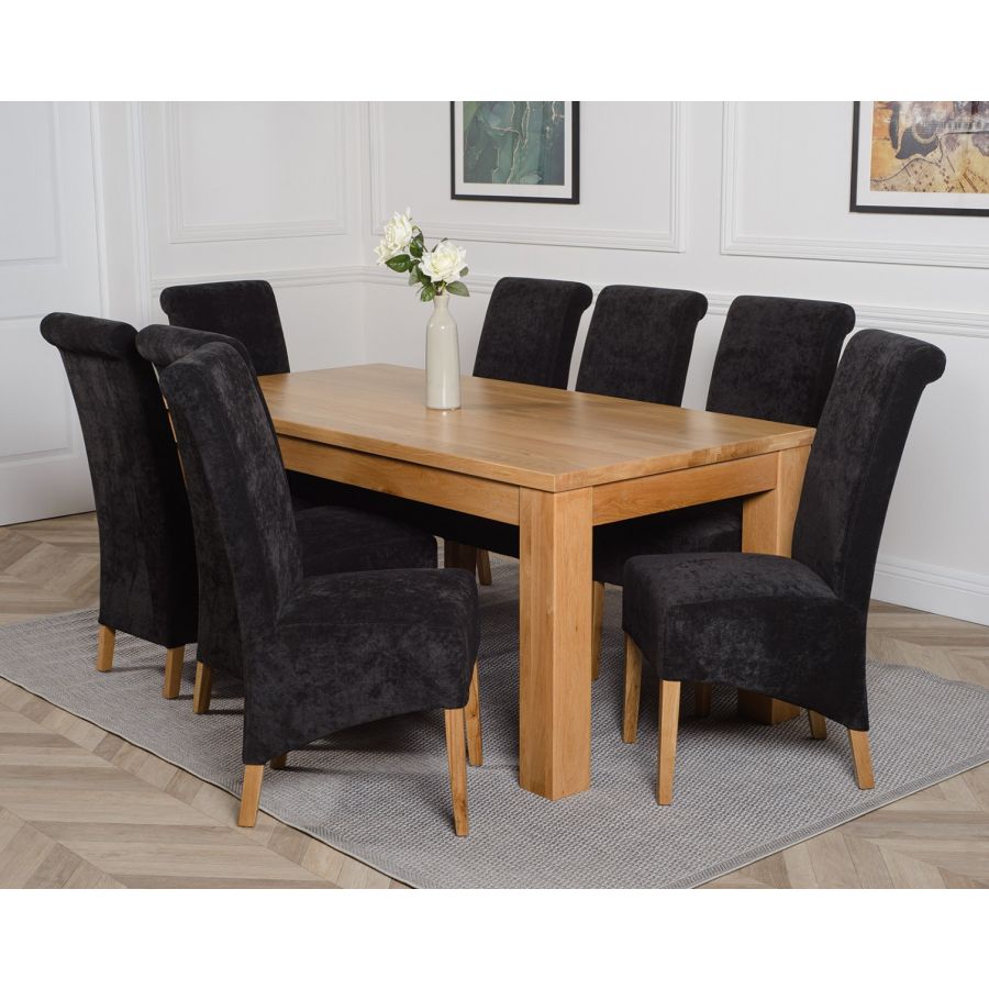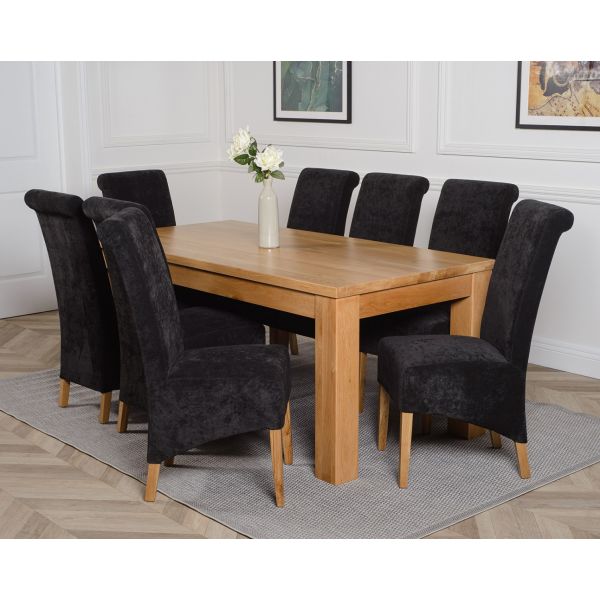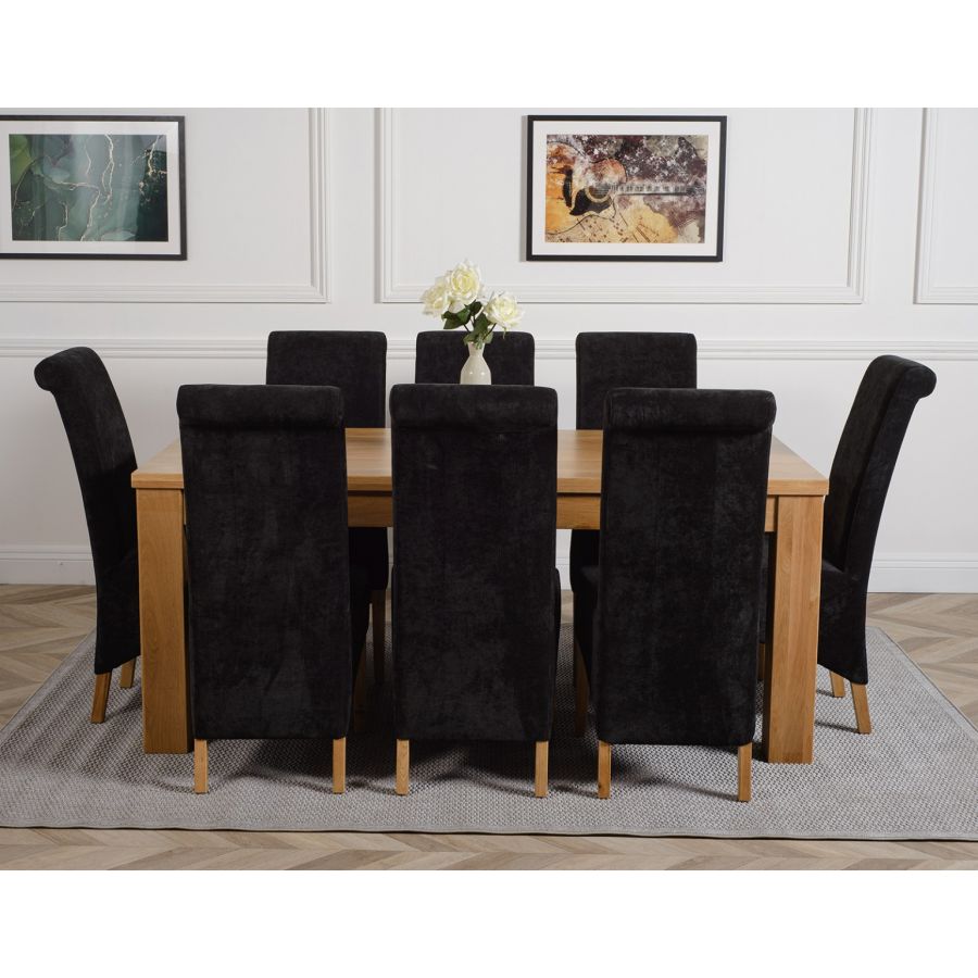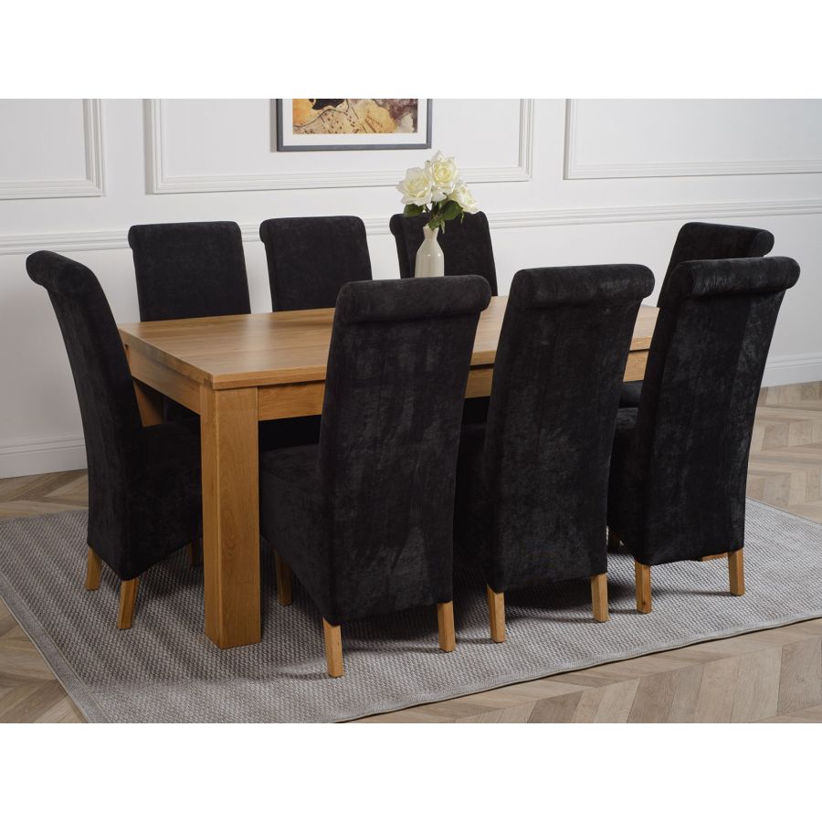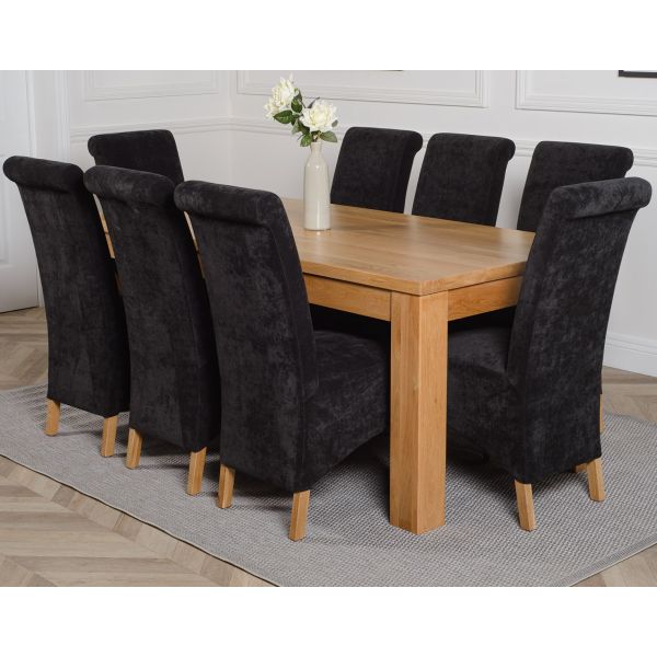 This dinner table and chairs set comes with 8 Montana dining chairs upholstered in luxurious black fabric with oak legs, hardwood frames and sprung seats for exceptional comfort and durability.