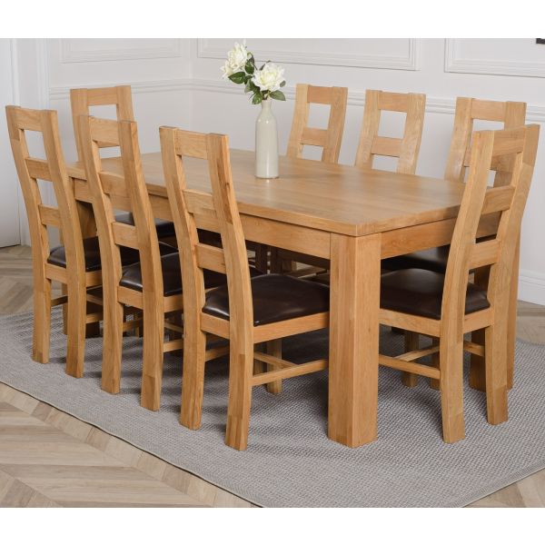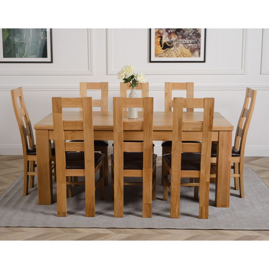 This dinner table and chairs set comes complete with 8 fully assembled Yale oak dining chairs made from solid oak with padded seats upholstered in brown bonded leather.