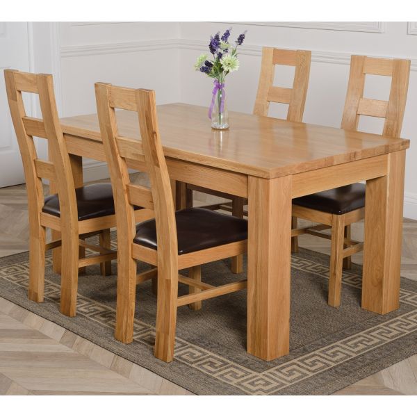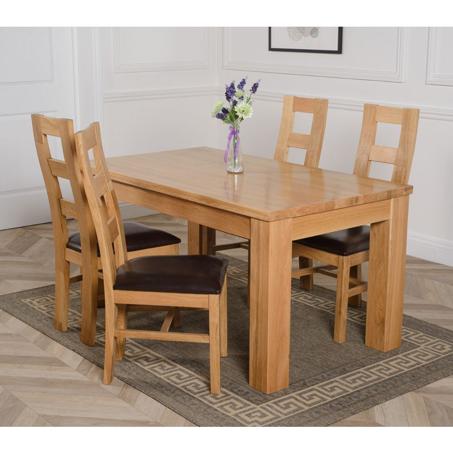 This dinner table and chairs set comes complete with 4 fully assembled Yale oak dining chairs made from solid oak with padded seats upholstered in brown bonded leather.