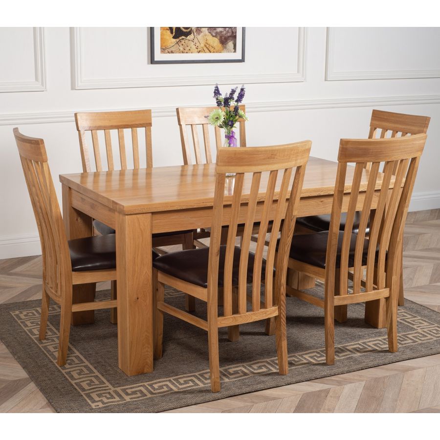 This dinner table and chairs set comes complete with 6 fully assembled Harvard slat back oak dining chairs, made from solid oak with padded seats upholstered in brown bonded leather.