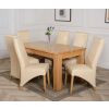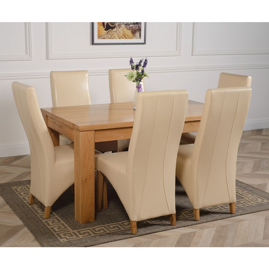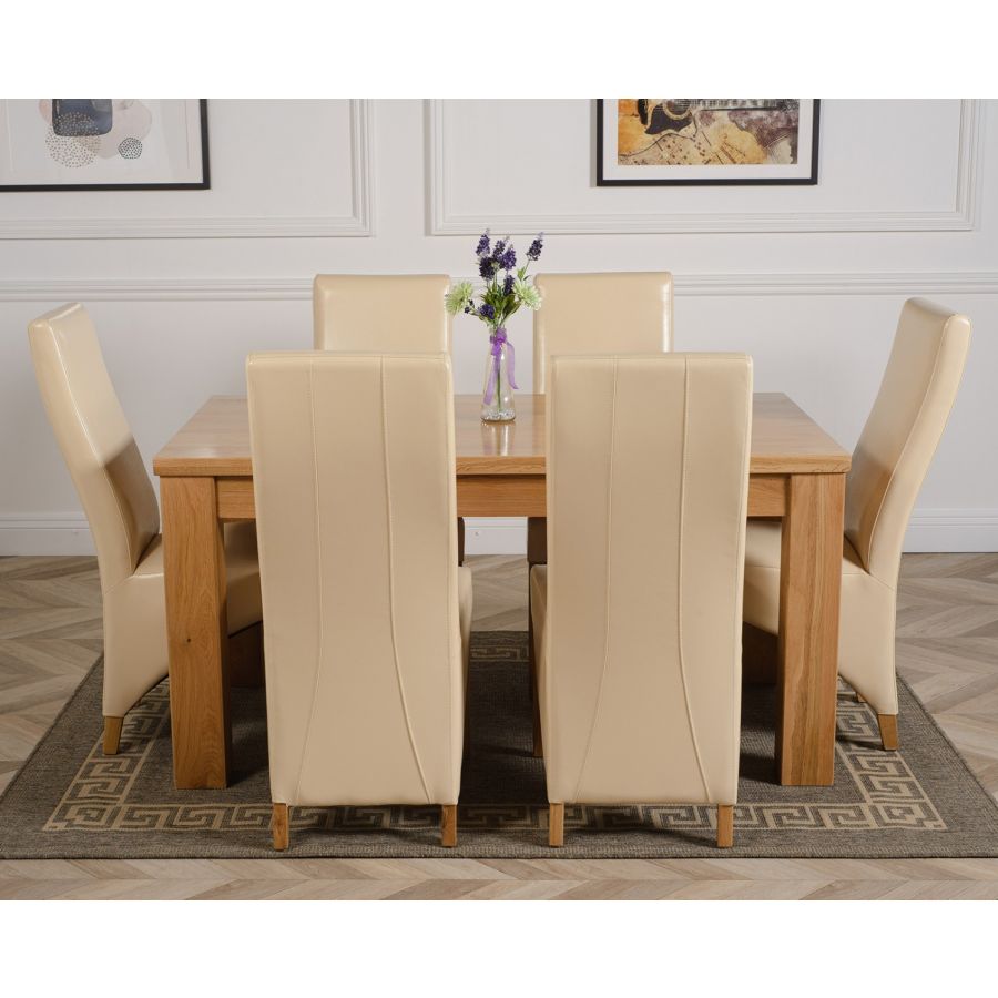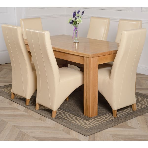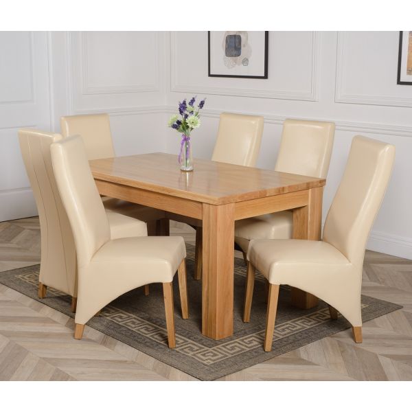 This dinner table and chairs set comes with 6 Lola leather dining chairs upholstered in bonded ivory leather with solid oak legs, hardwood frame and a sprung seat for exceptional comfort and durability.
