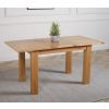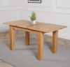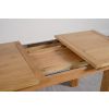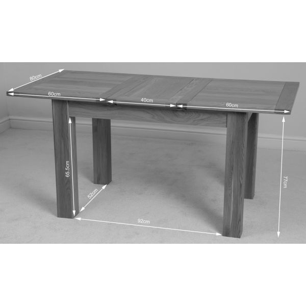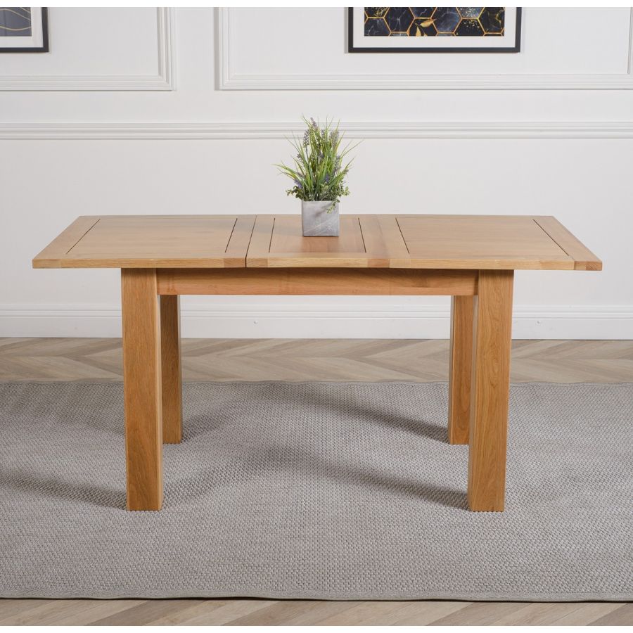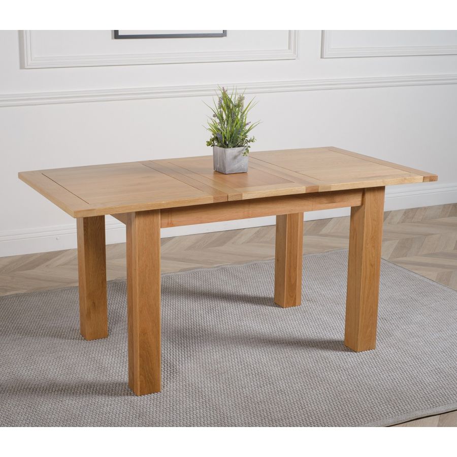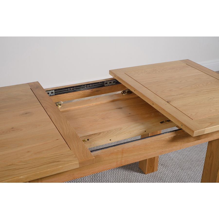 This extending oak dining table and chairs is ideal for formal entertaining or casual family dining. Standing on chunky solid 10x10cm wooden legs, this oak extendable dining table and chairs will fit into any modestly-sized room. Standing at a height of 77cm the solid oak table top measures 120 x 80cm when closed and extends to 160cm in length using the 40cm extension panel stored under the table top, comfortably accommodating up to 6 people.