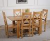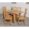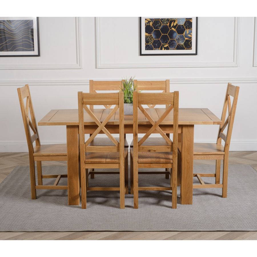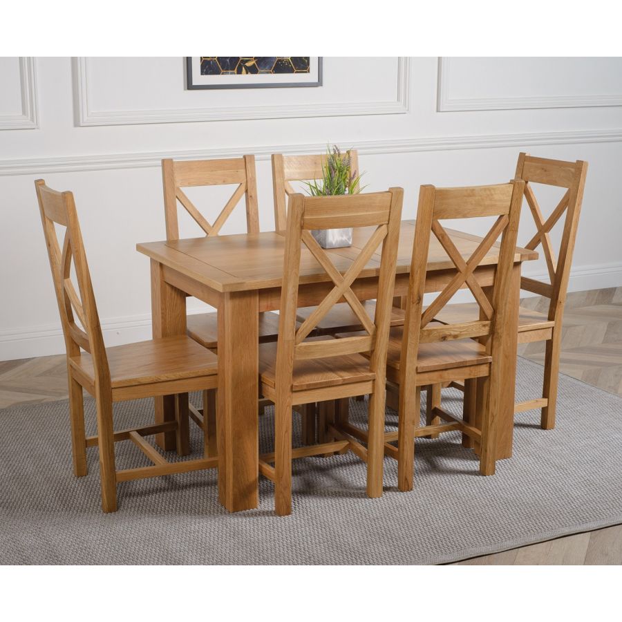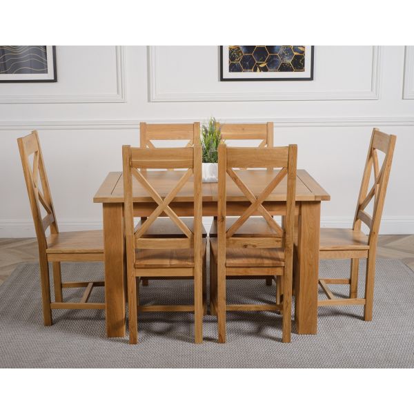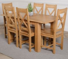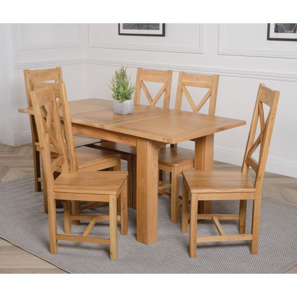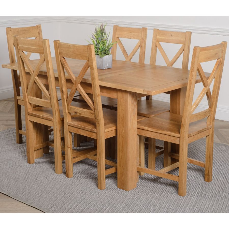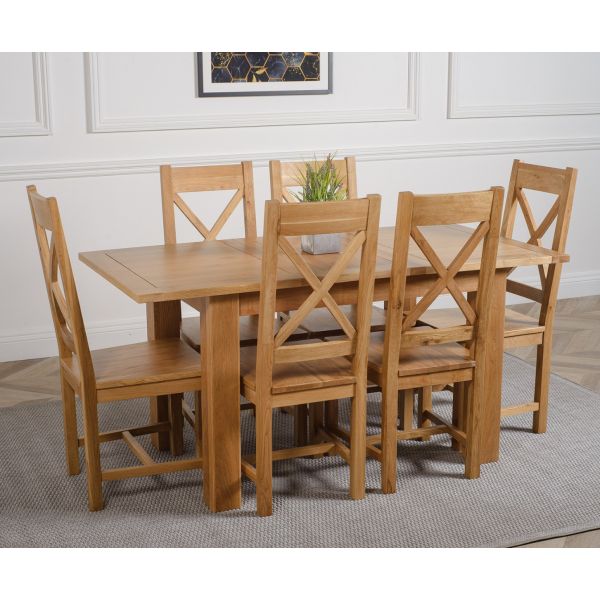 The Hampton extendable oak dining table set comes complete with 6 fully assembled Berkeley oak dining chairs made from solid oak with a cross back design, durable solid oak seats and braced legs for extra support.