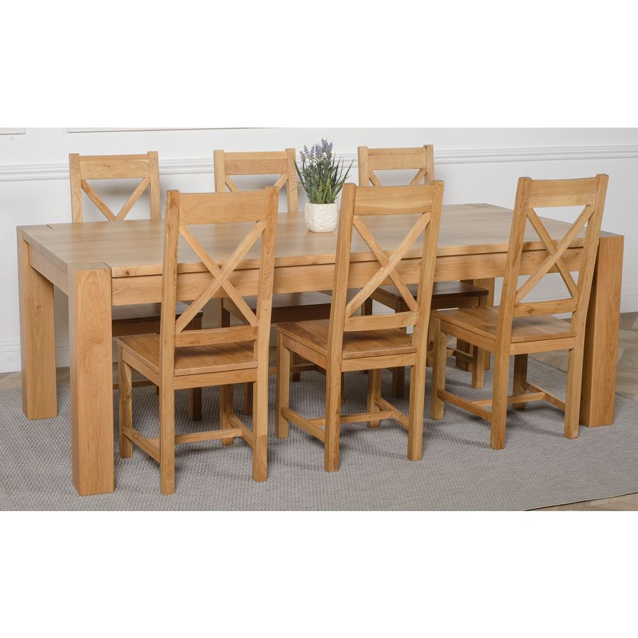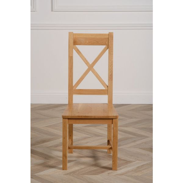 The Kuba solid oak dining set comes complete with 6 fully assembled Berkeley oak dining chairs made from solid oak with a cross back design, durable solid oak seats and braced legs for extra support.