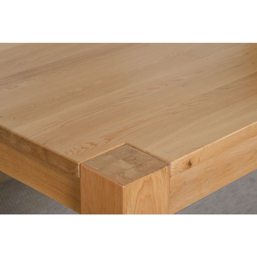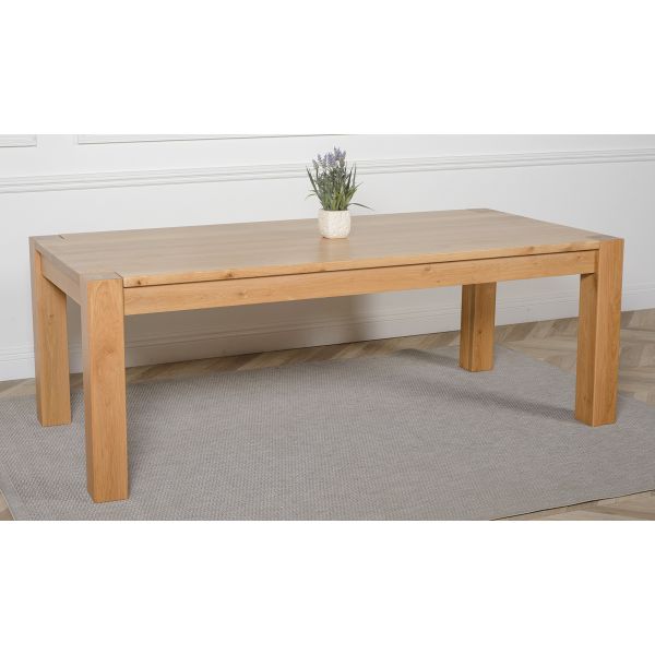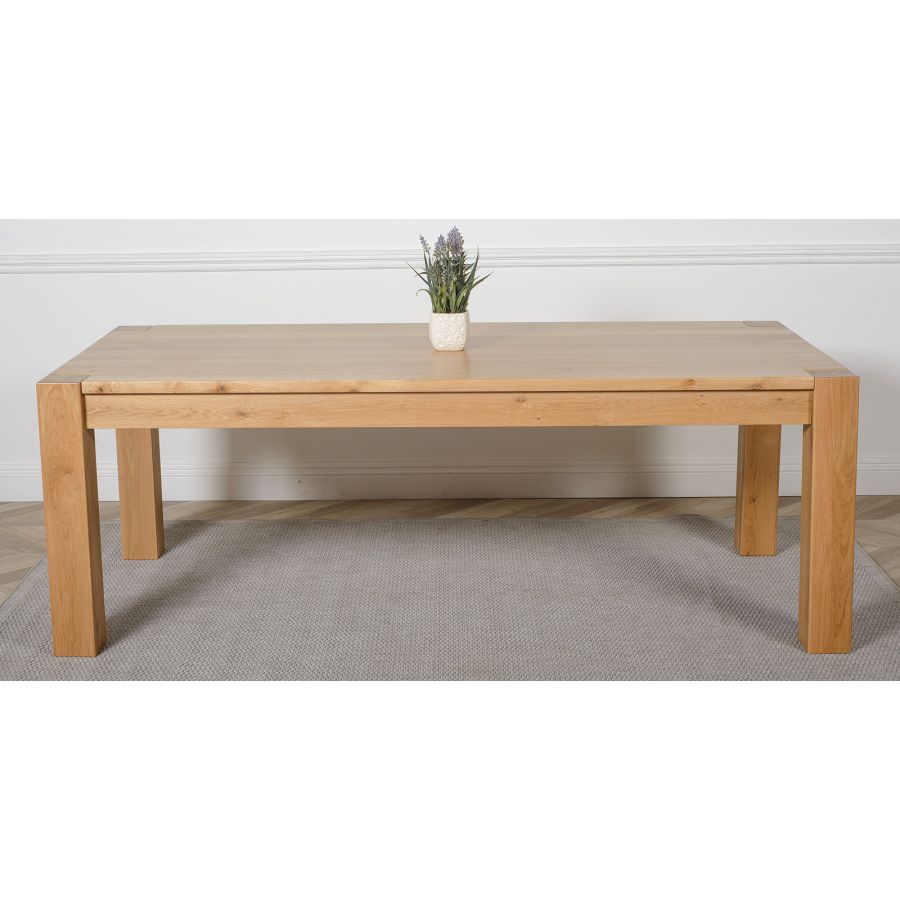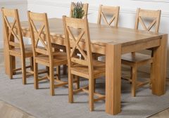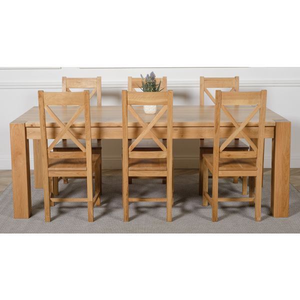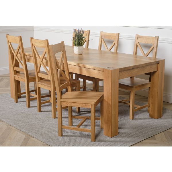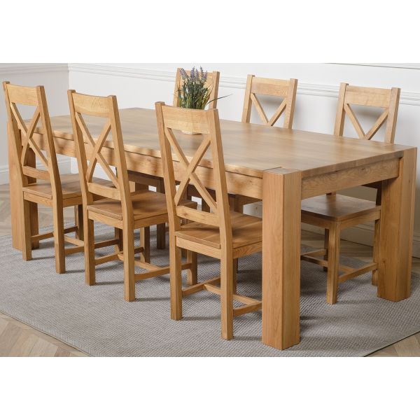 The Kuba 220cm chunky solid oak dining table and 6 chairs is a distinctive large oak table and chairs set designed for the modern home. Ideal for everyday family dining and entertaining guests the high quality workmanship and functional design makes this 100% solid oak dining table and chairs set 6 stand out from other oak dining sets. The spacious Kuba oak dining set will add a touch of warmth to your home with its natural oak hue and sophisticated oak chairs.