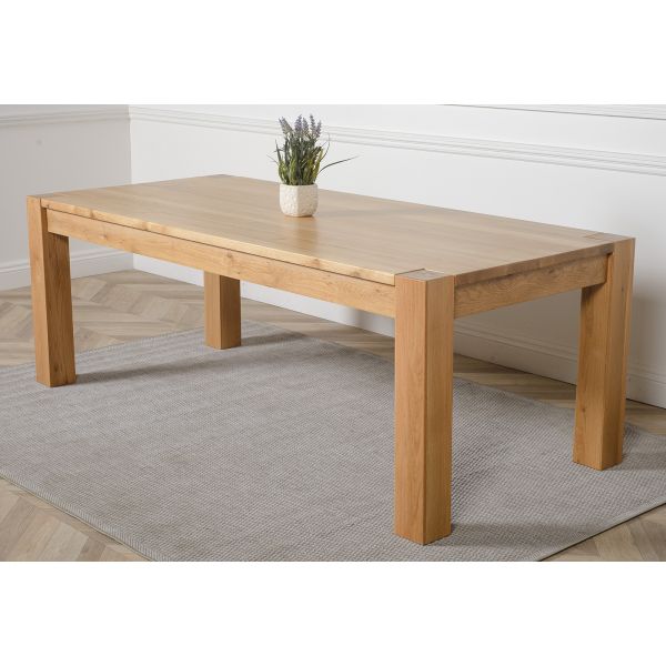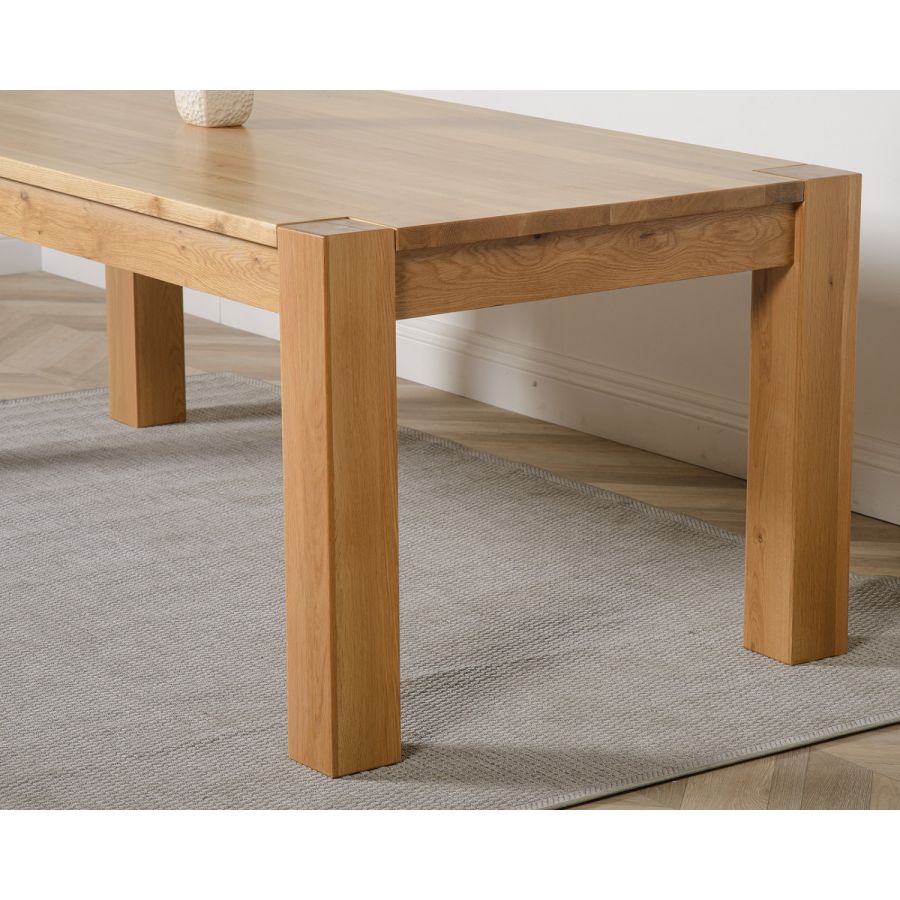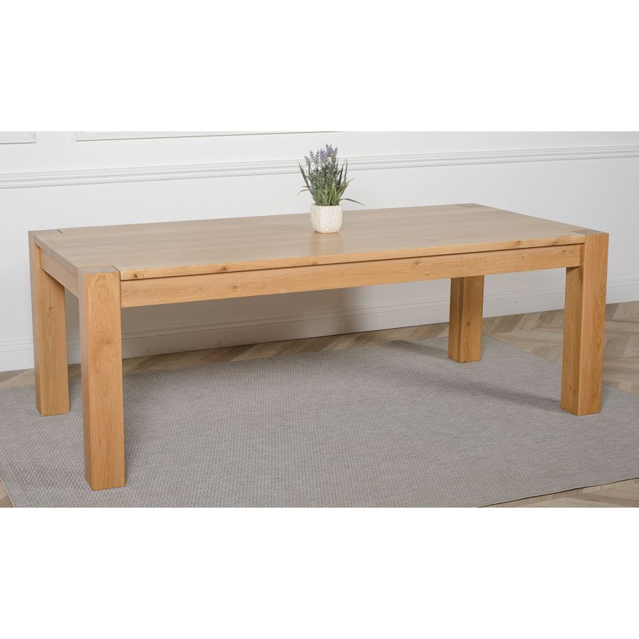 The Kuba 220cm chunky solid oak dining table and 8 chairs is a distinctive large oak table and chairs set designed for the modern home. Ideal for everyday family dining and entertaining guests the high quality workmanship and functional design makes this 100% solid oak dining table and chairs set 8 stand out from other oak dining sets. The spacious Kuba oak dining set will add a touch of warmth to your home with its natural oak hue and sophisticated oak chairs.
