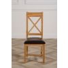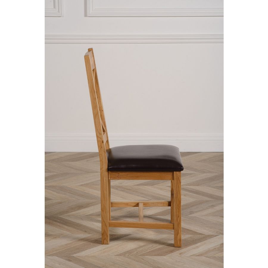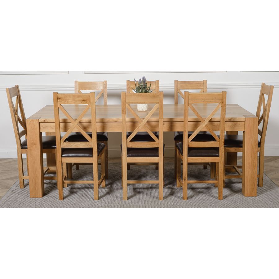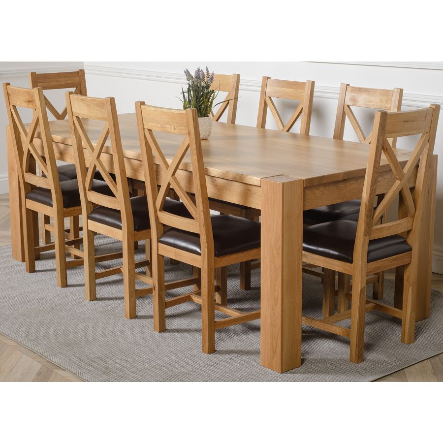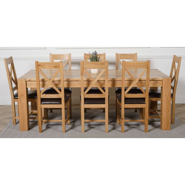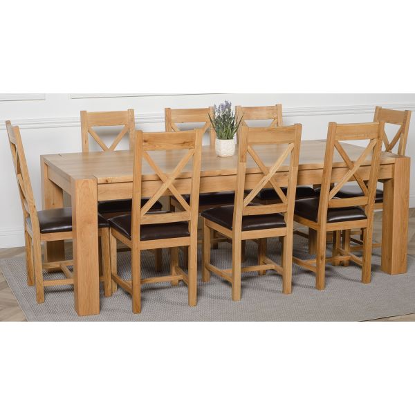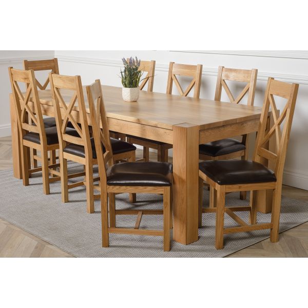 The Kuba solid oak dining set comes complete with 8 fully assembled Berkeley oak dining chairs made from solid oak with a cross back design, comfortable cushioned brown leather seat and braced legs for extra support.