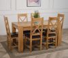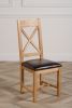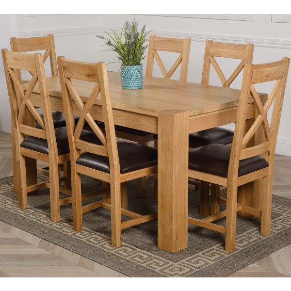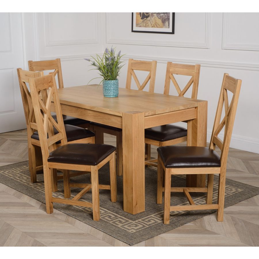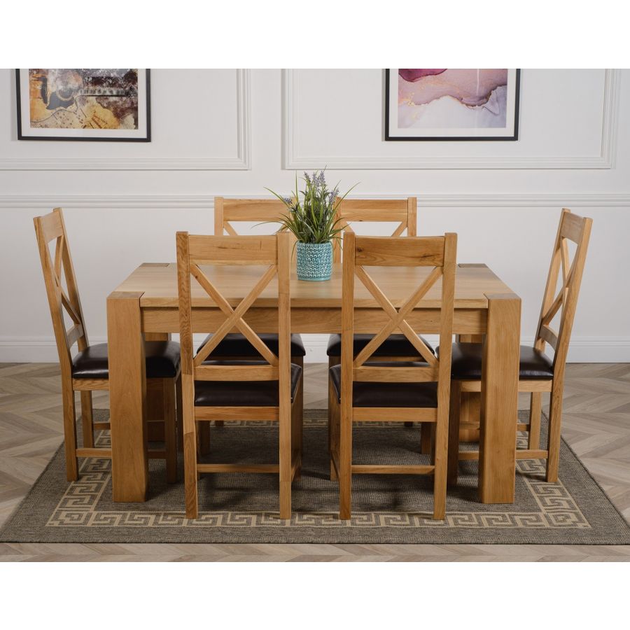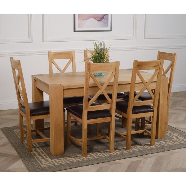 The Kuba oak dining table set comes complete with 6 fully assembled Berkeley oak dining chairs made from solid oak with a cross back design, comfortable cushioned brown leather seat and braced legs for extra support.
