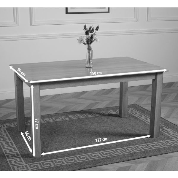 A comfortable dining table with chairs, measuring 150 x 90cm, this dining table set is practical and easy to maintain thanks to its no fuss wipe clean lacquer wood seal.