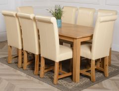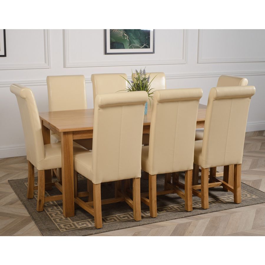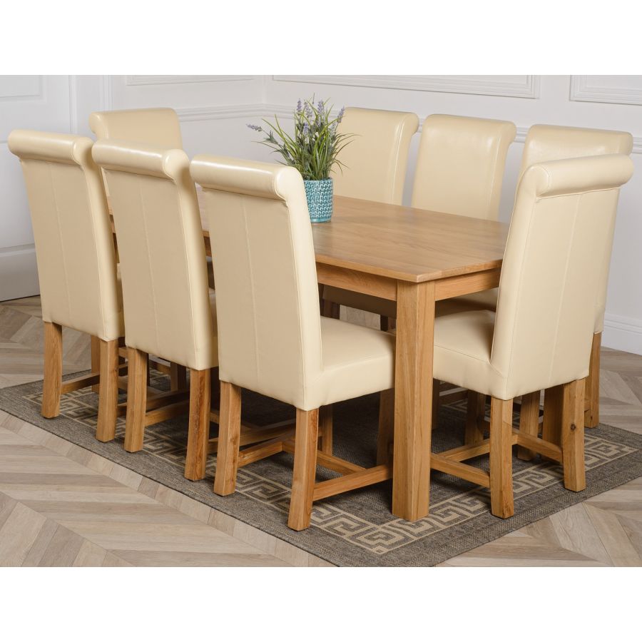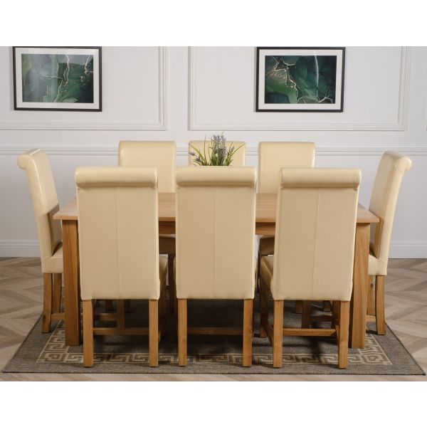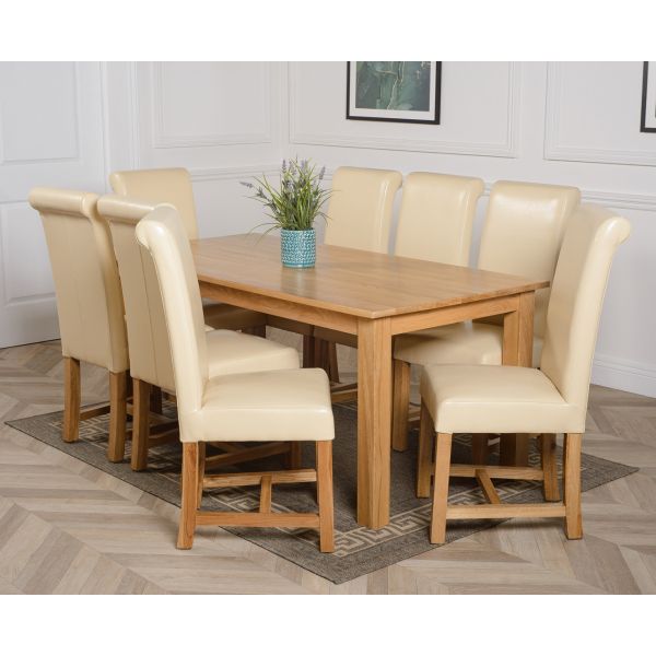 This large table and chairs comes with 8 Washington dining chairs upholstered in bonded ivory leather with solid oak legs, hardwood frame and a sprung seat for exceptional comfort and durability.
