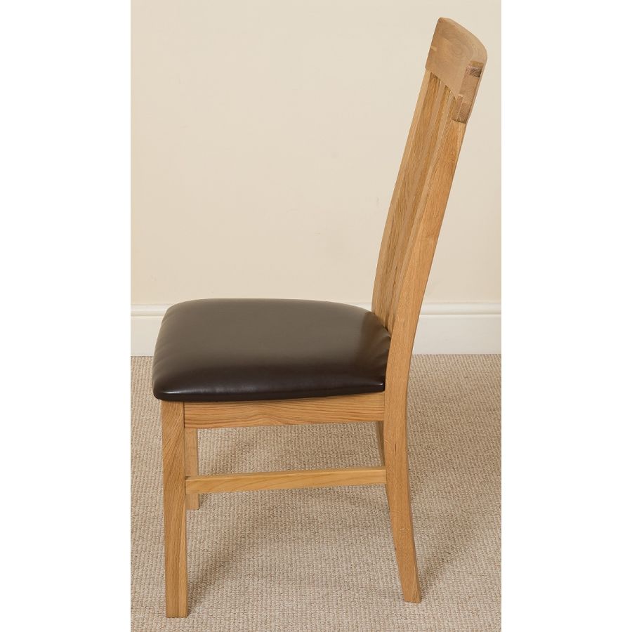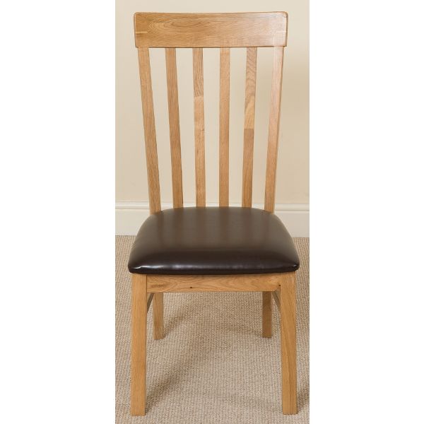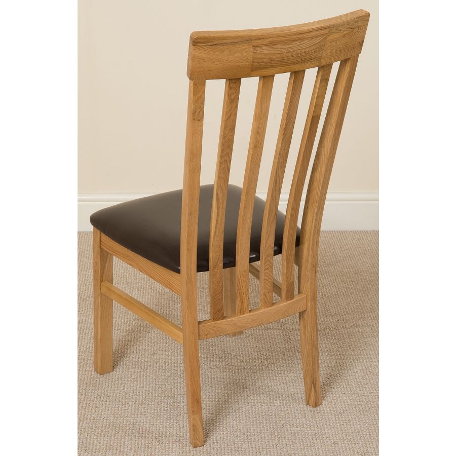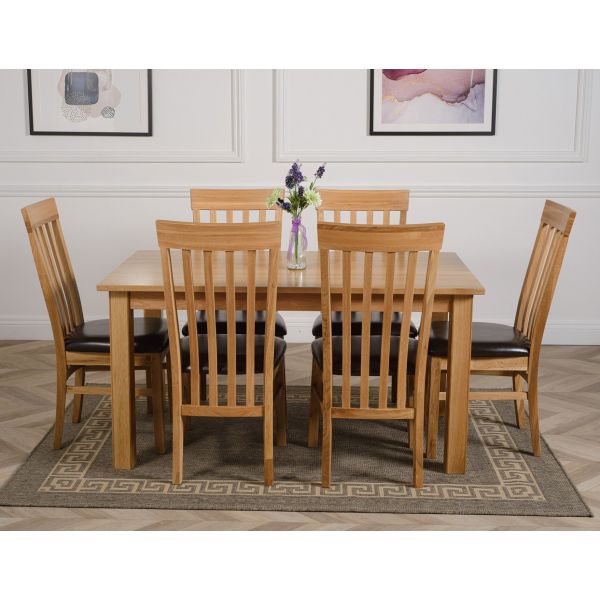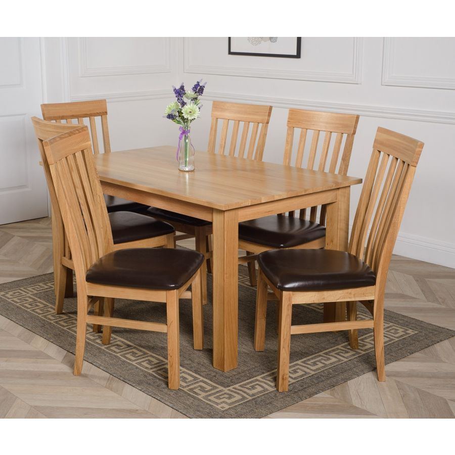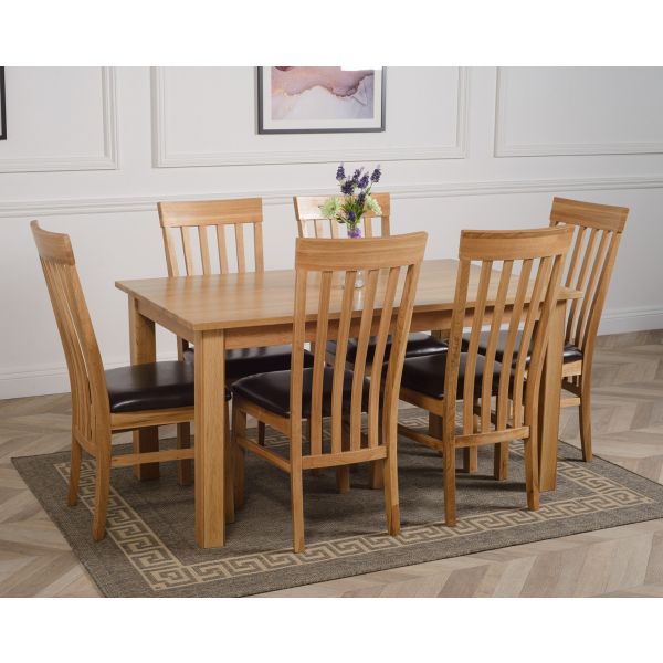 This medium table and chairs comes complete with 6 fully assembled Harvard slat back oak dining chairs made from solid oak with padded seats upholstered in brown bonded leather.