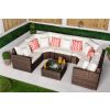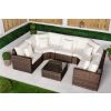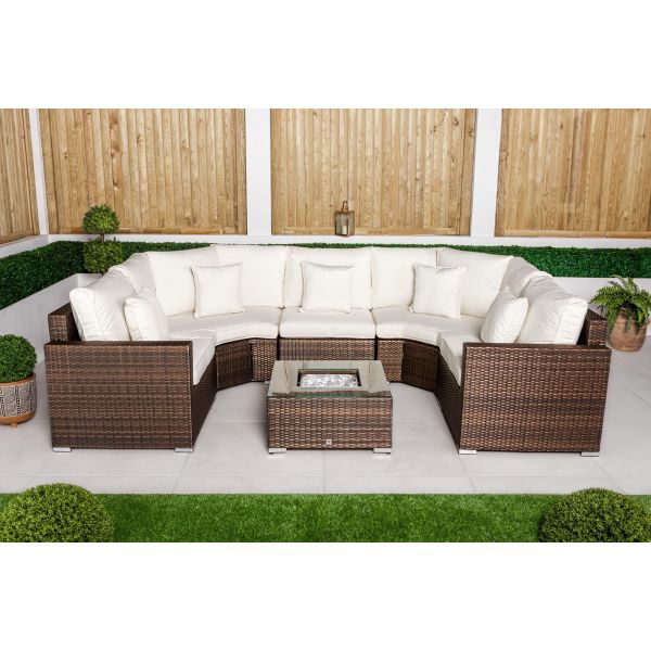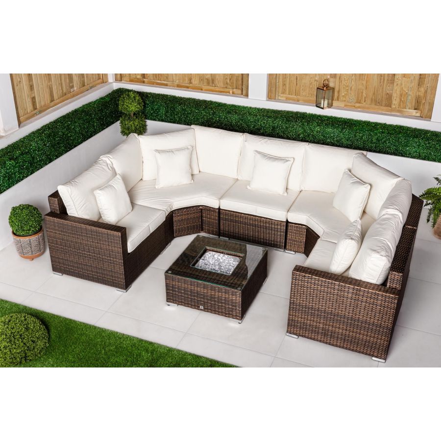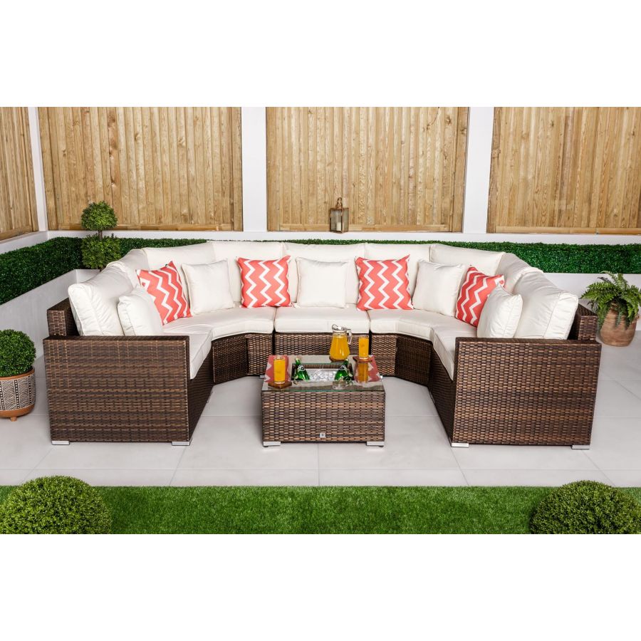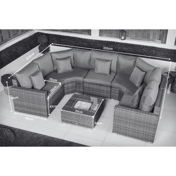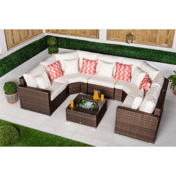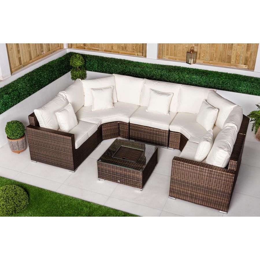 The compact U-shaped layout features the Santorini’s distinctive larger angled corner sections, creating a smooth seating flow and an inviting wraparound feel while remaining well suited to space-conscious outdoor areas. Finished in contemporary hand-woven rattan and paired with deep, supportive cushions, the set combines elegant styling with everyday outdoor practicality.