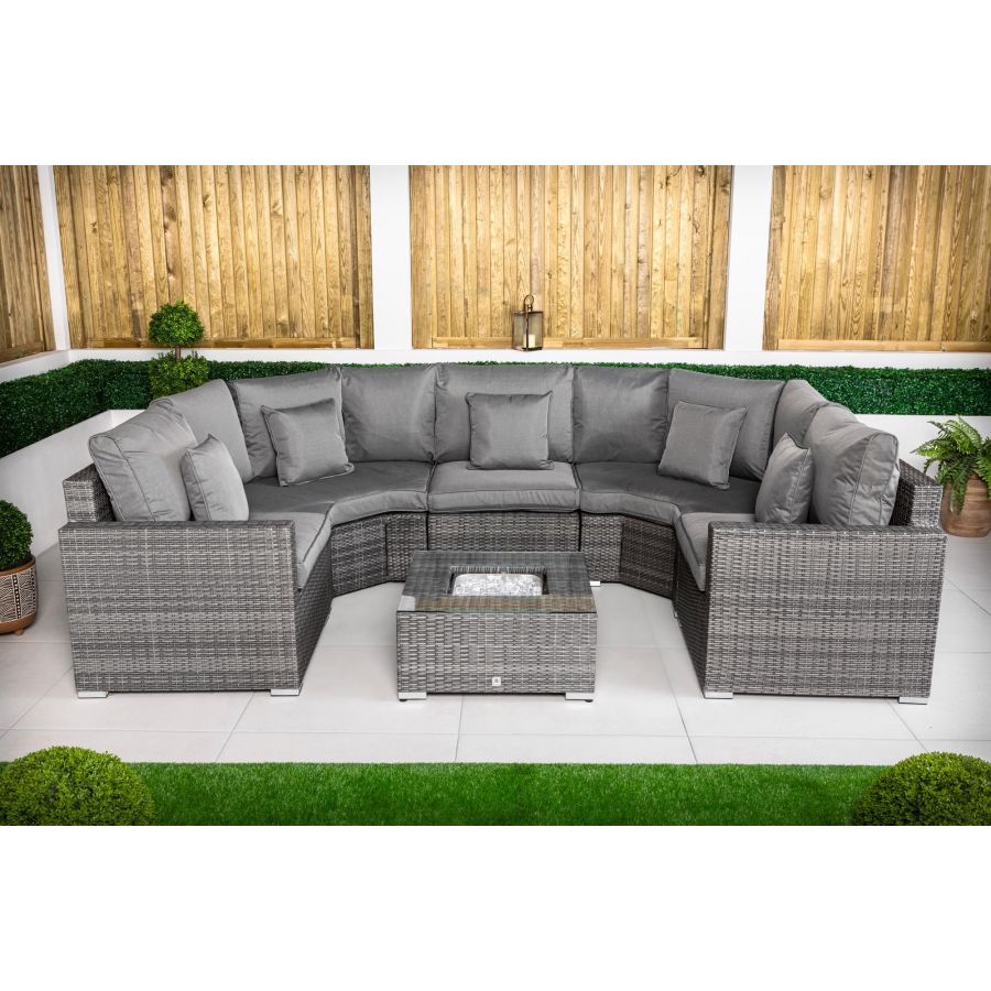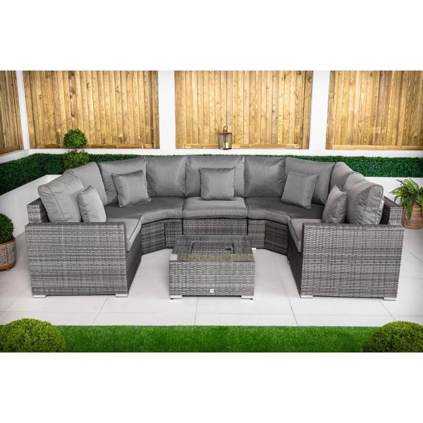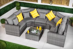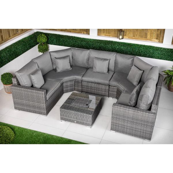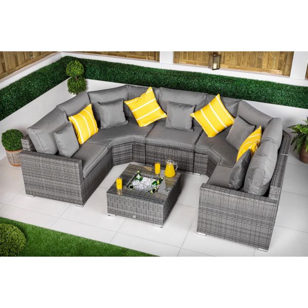 The compact U-shaped layout features the Santorini’s distinctive larger angled corner sections, creating a smooth seating flow and an inviting wraparound feel while remaining well suited to space-conscious outdoor areas. Finished in contemporary hand-woven rattan and paired with deep, supportive cushions, the set combines elegant styling with everyday outdoor practicality.