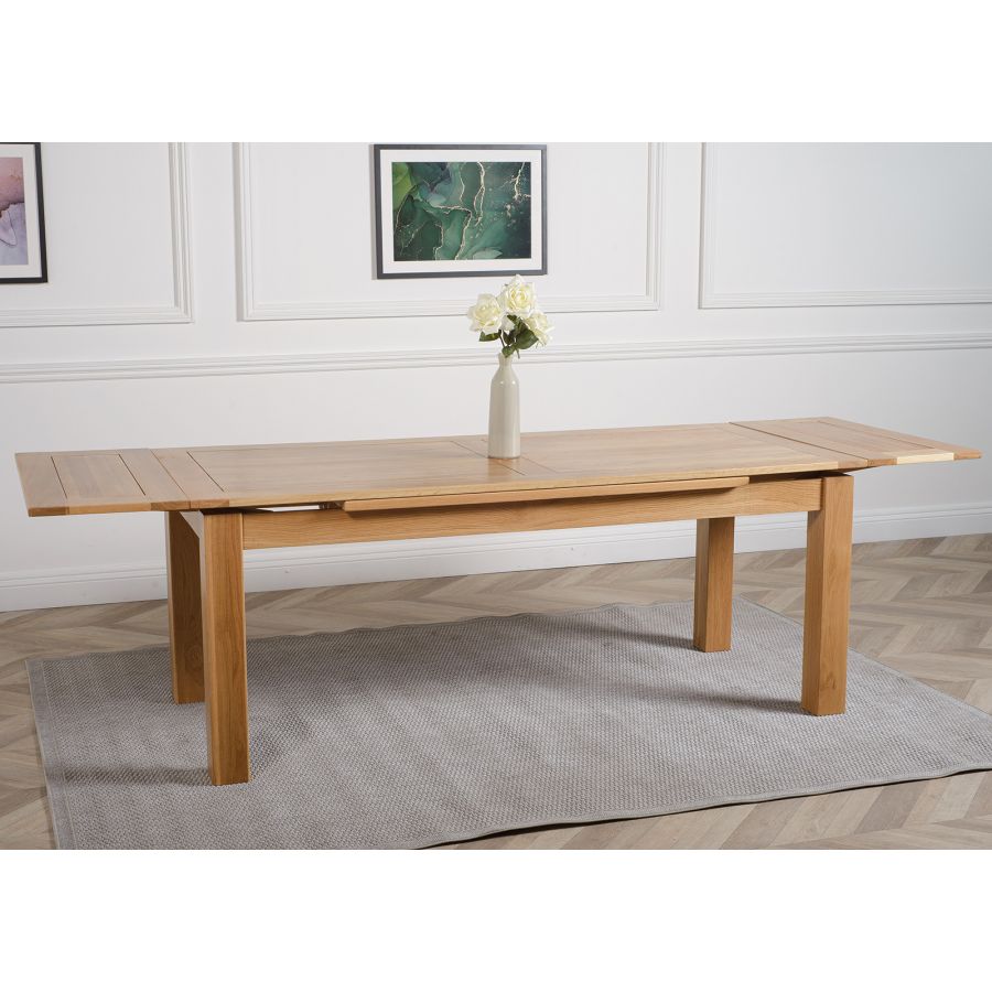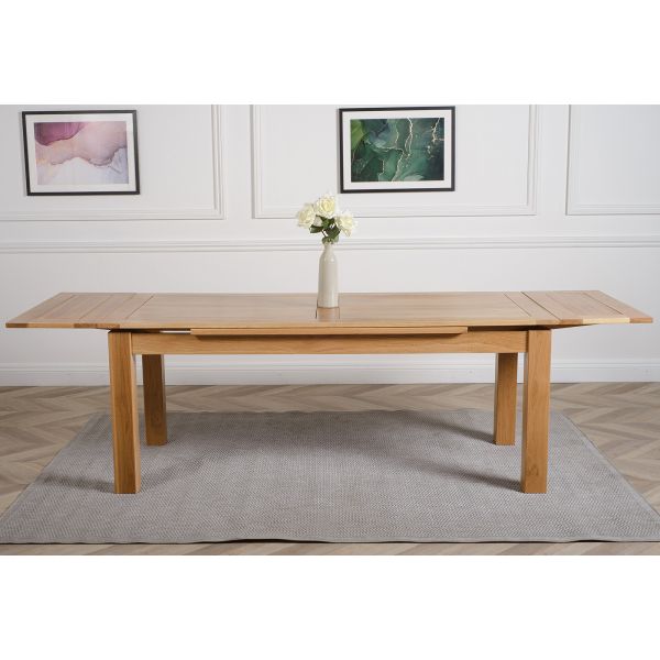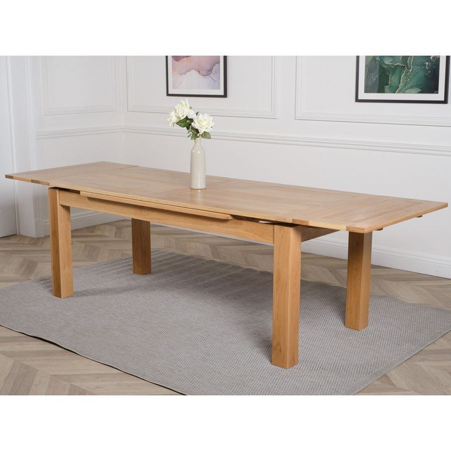 Ideal for family gatherings or accommodating last-minute meal time guests, this large solid oak extending dining table and chairs set can seat up to 10 people when fully extended. Measuring 200 x 90cm as standard, the Richmond solid oak dining table extends to an impressive 280cm using two 40cm extension panels at each end of the table. When not in use, the extension leaves store neatly under the table top.