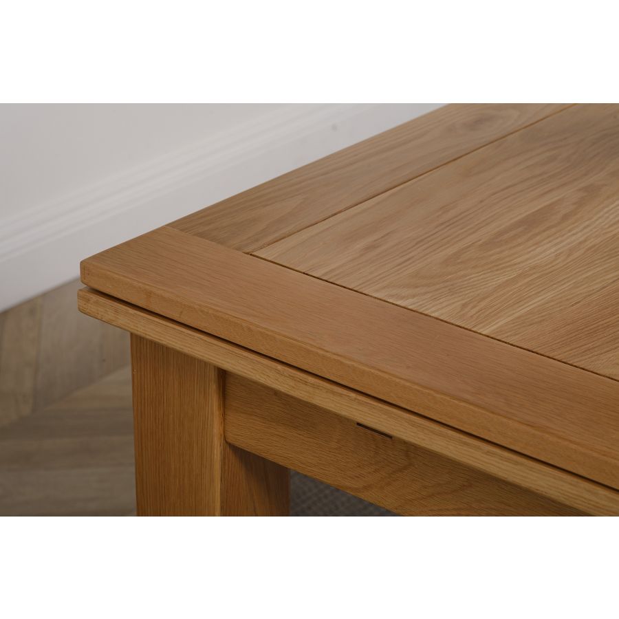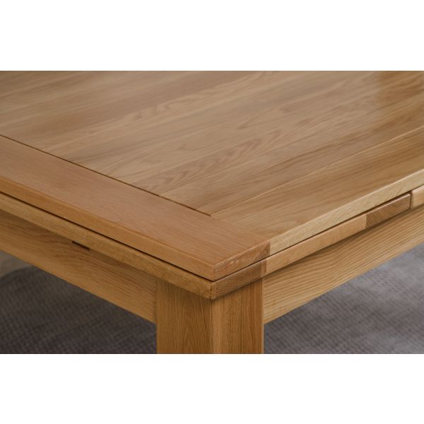 Quality craftsmanship, our oak dining table sets are proudly handmade from sustainably sourced oak timber using time-honoured techniques. Inlaid grooves on the table top allow for natural expansion of the wood over time and prevent bowing, a sure sign of quality design. Each piece goes through a process of fine sanding and polishing for a smooth finish which is sealed in a clear lacquer protecting and enhancing the appearance of the wood grain on this oak extendable dining table and chairs set.