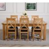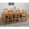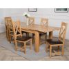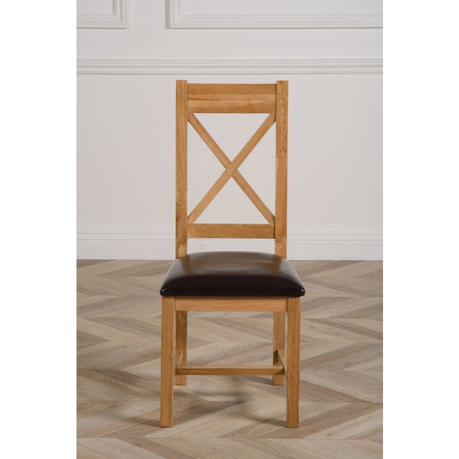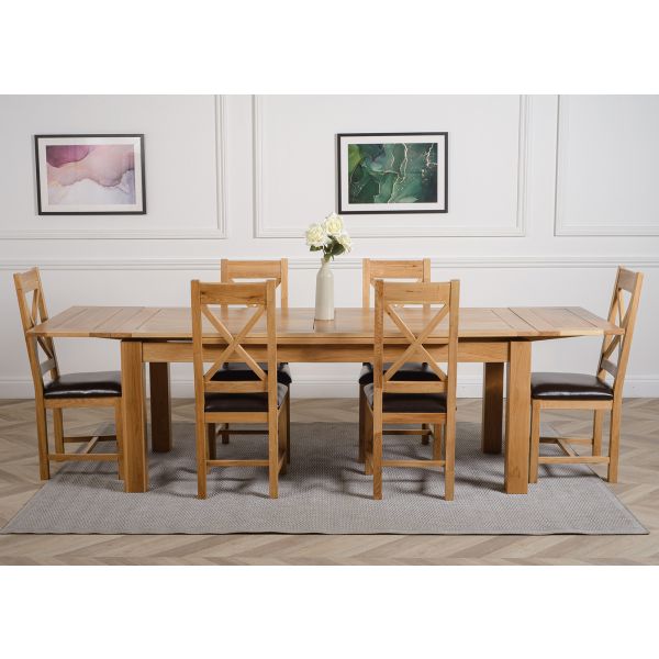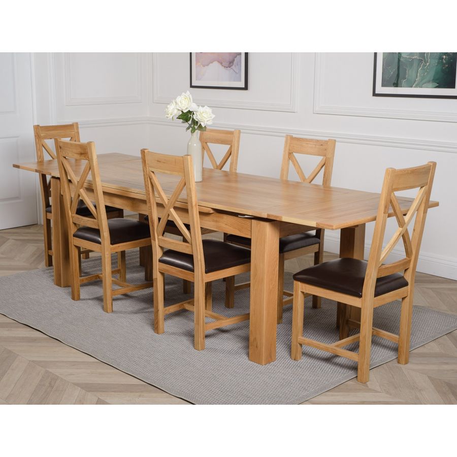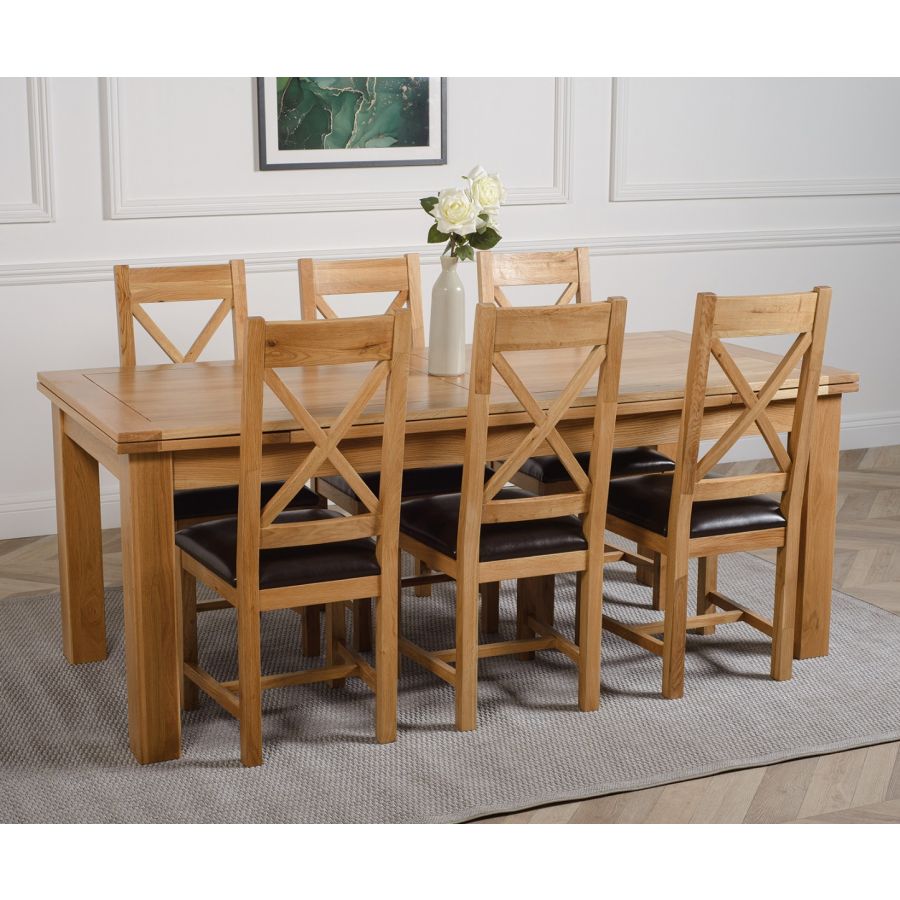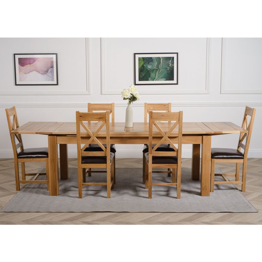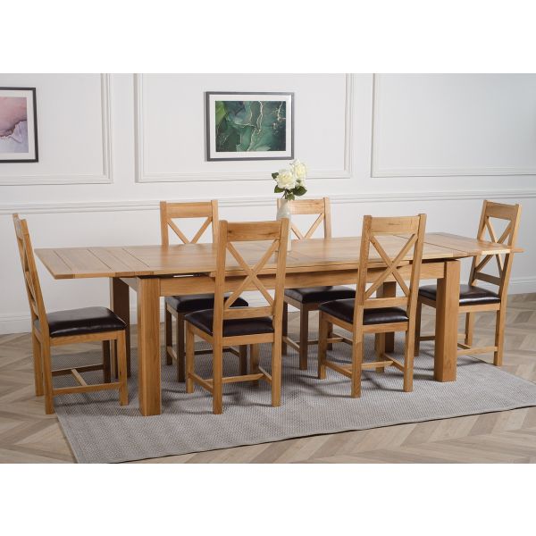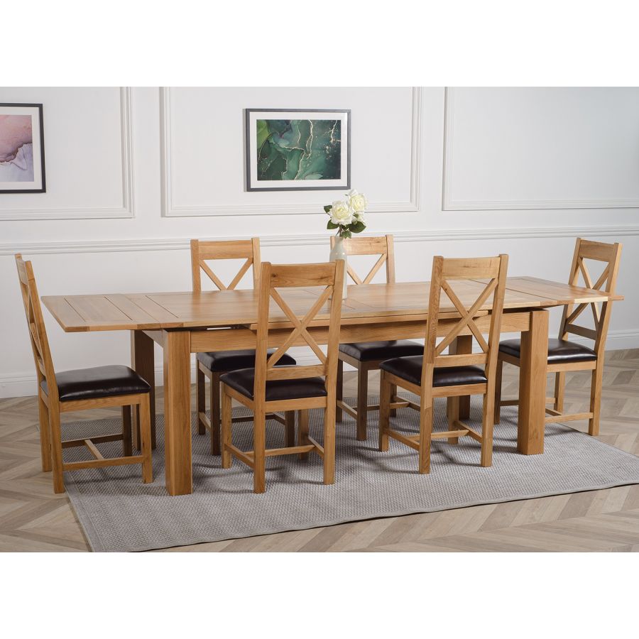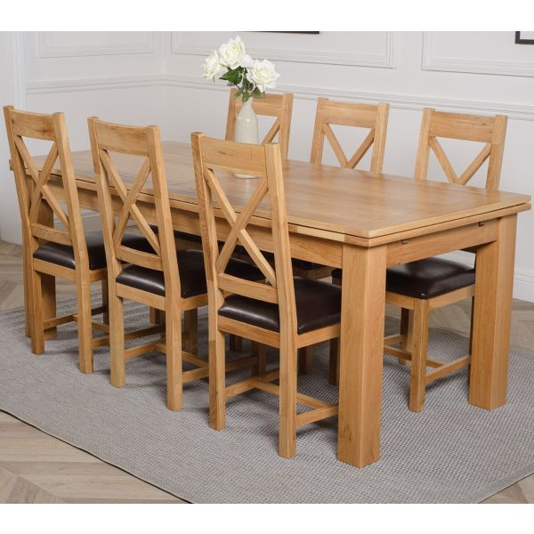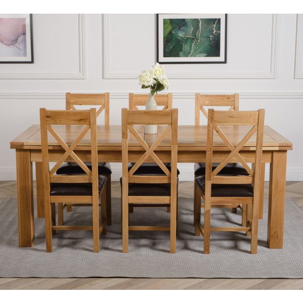 This high quality wooden dining table set comes complete with 6 fully assembled Berkeley oak dining chairs made from solid oak with a cross back design, comfortable cushioned brown leather seat and braced legs for extra support.