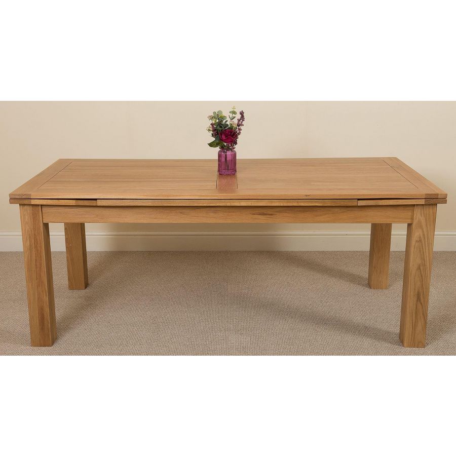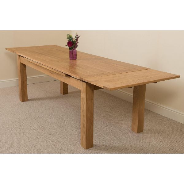 Ideal for family gatherings or accommodating last-minute meal time guests, this large solid oak extending dining table and chairs set can seat up to 10 people when fully extended. Measuring 200 x 90cm as standard the Richmond solid oak dining table extends to an impressive 280cm using two 40cm extension panels at each end of the table. When not in use, the extension leaves store neatly under the table top.