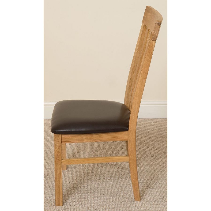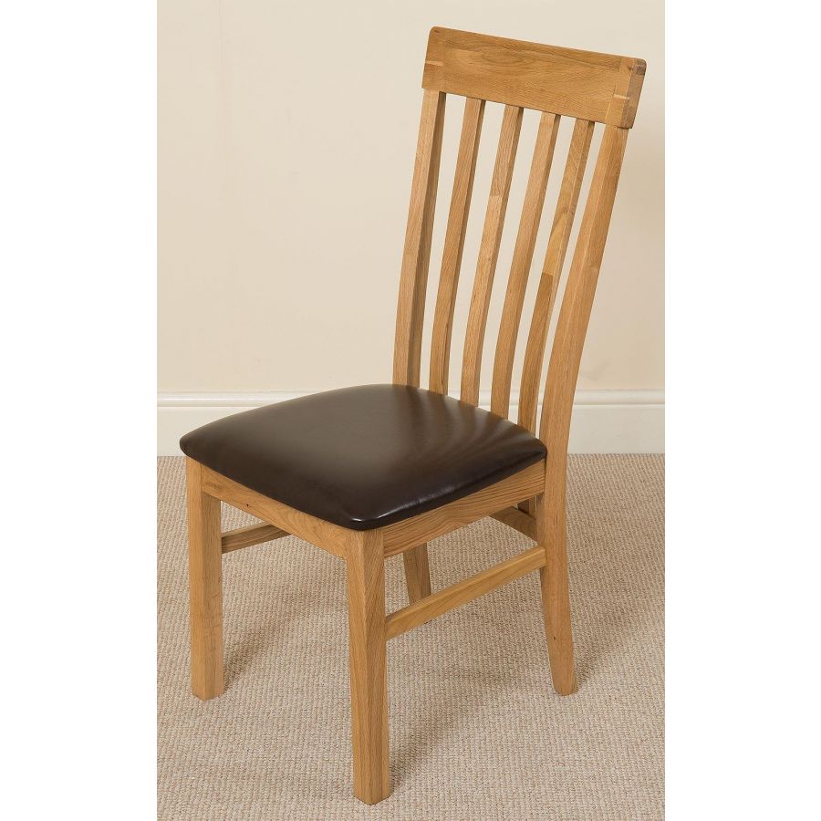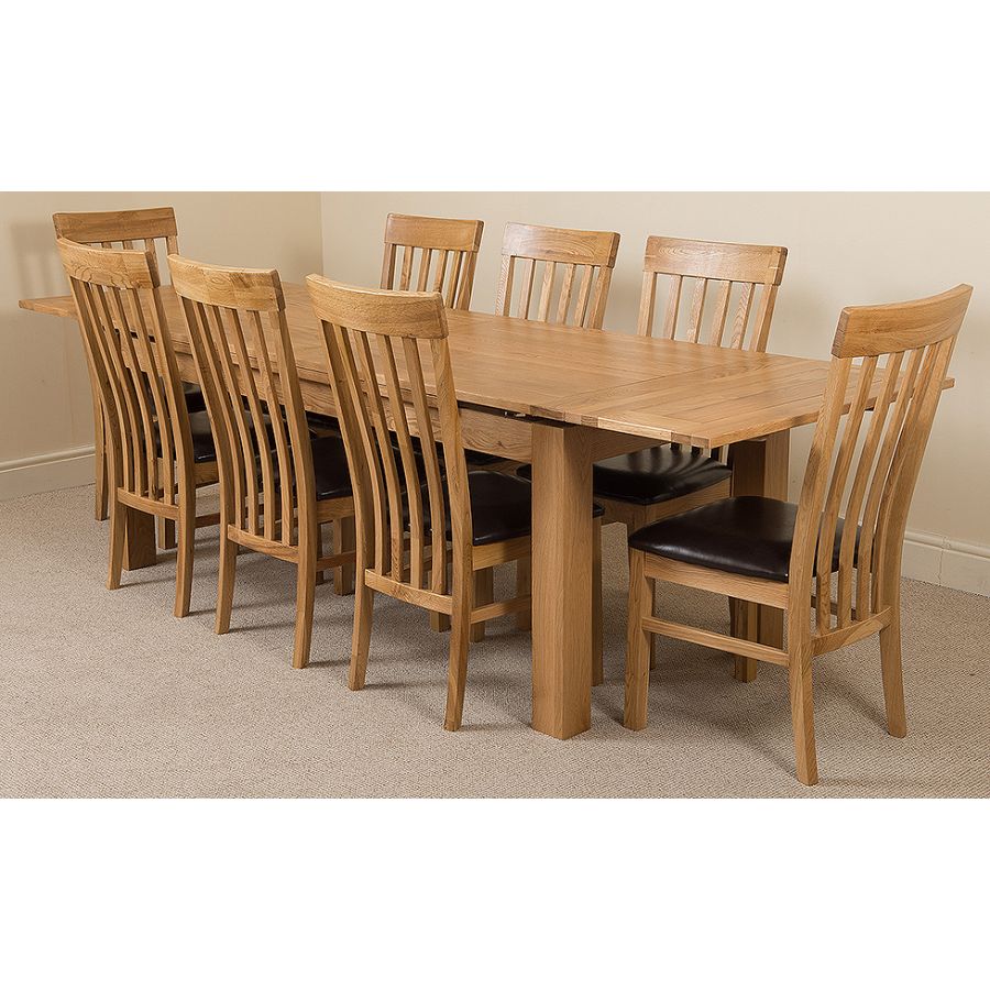 8 x premium Harvard oak dining chairs are included in this high quality wooden dining table set. The Harvard slat back oak dining chairs are made from solid oak timber with a medium-density padded seat and upholstered in brown bonded leather. Traditional yet stylish these solid oak chairs are the perfect companion for the Richmond oak extending dining table with their curved back design and braced legs. As a testament to their quality, the Harvard oak dining chairs require no assembly and come expertly crafted and built.