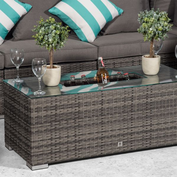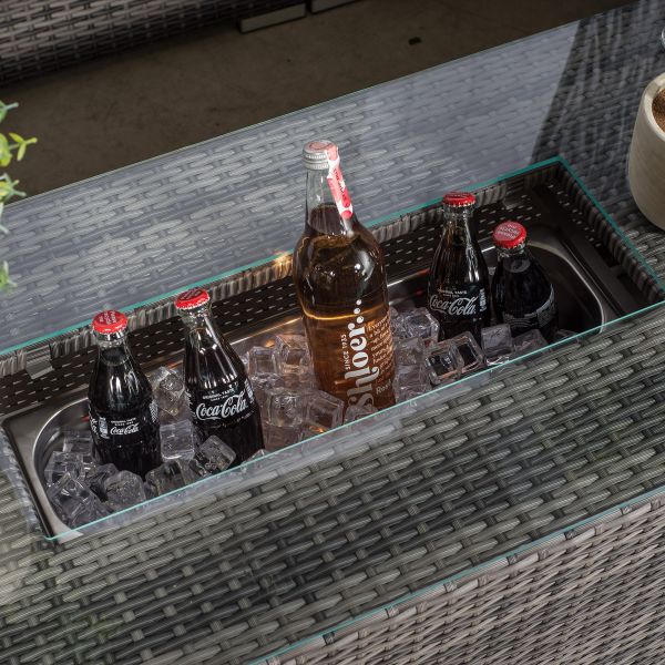 The glass top coffee table with built-in drinks cooler provides the perfect setting for drinks and snacks. Simply fill the stainless steel cooler with ice and enjoy chilled drinks all day long, great for hosting parties, barbeques and other outdoor events.
