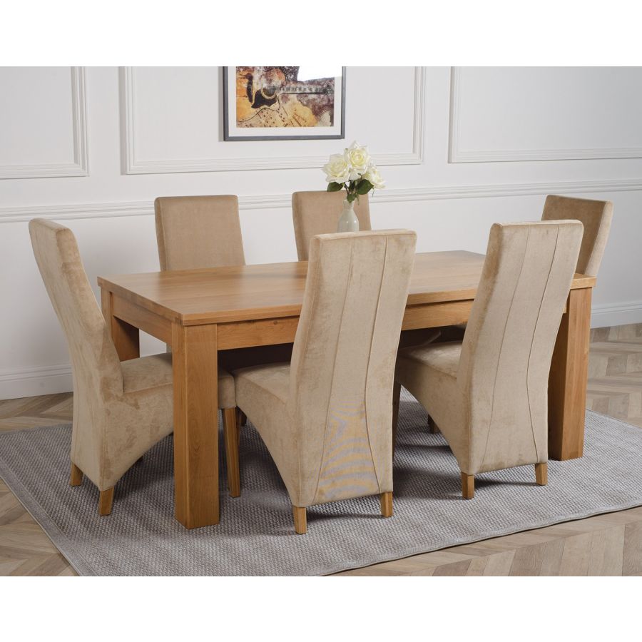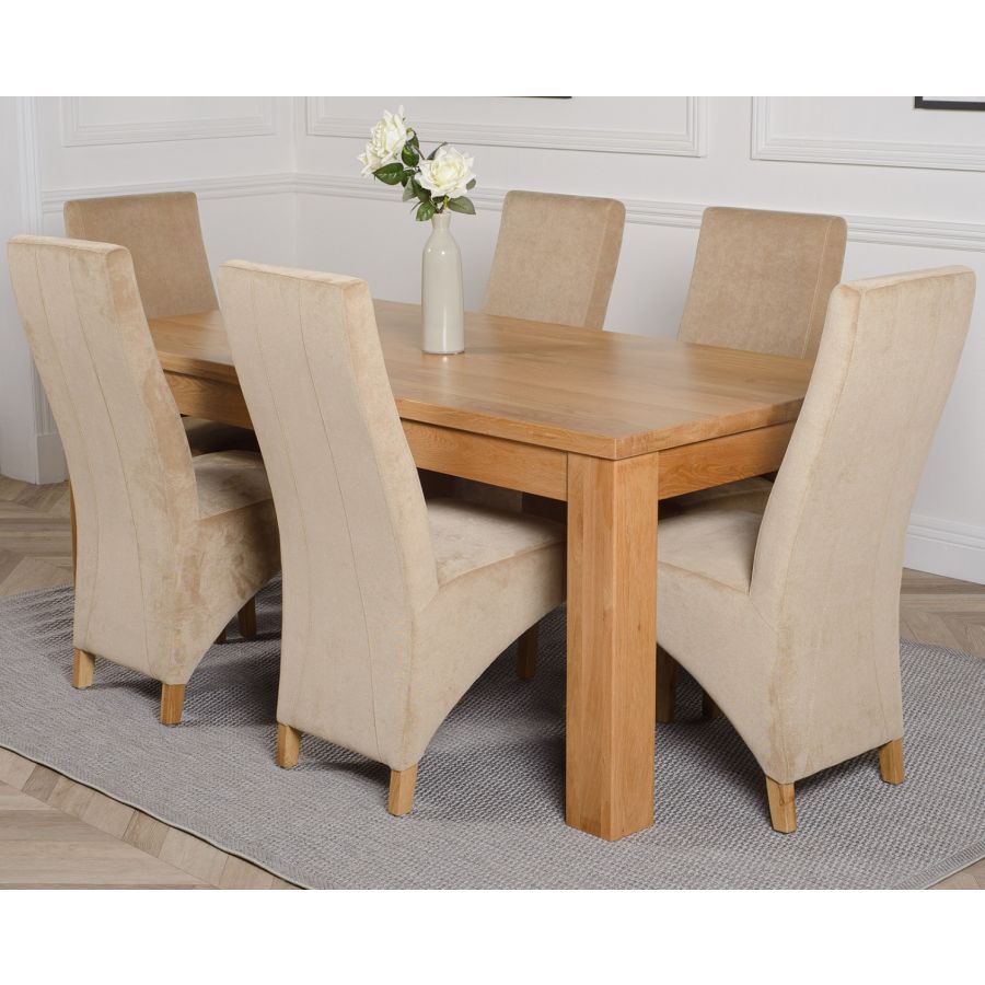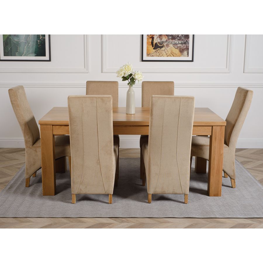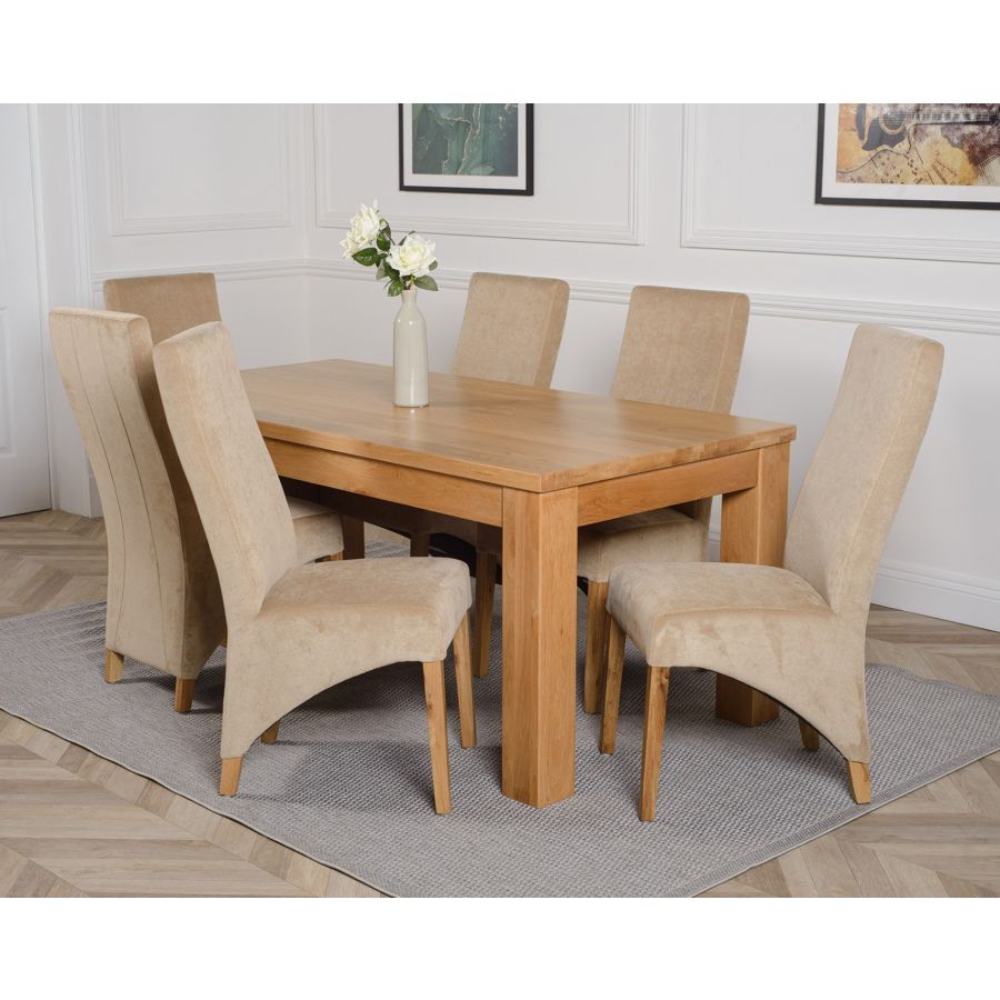 This dinner table and chairs set comes with 6 Lola fabric dining chairs upholstered in beige fabric with solid oak legs, hardwood frame and a sprung seat for exceptional comfort and durability.