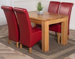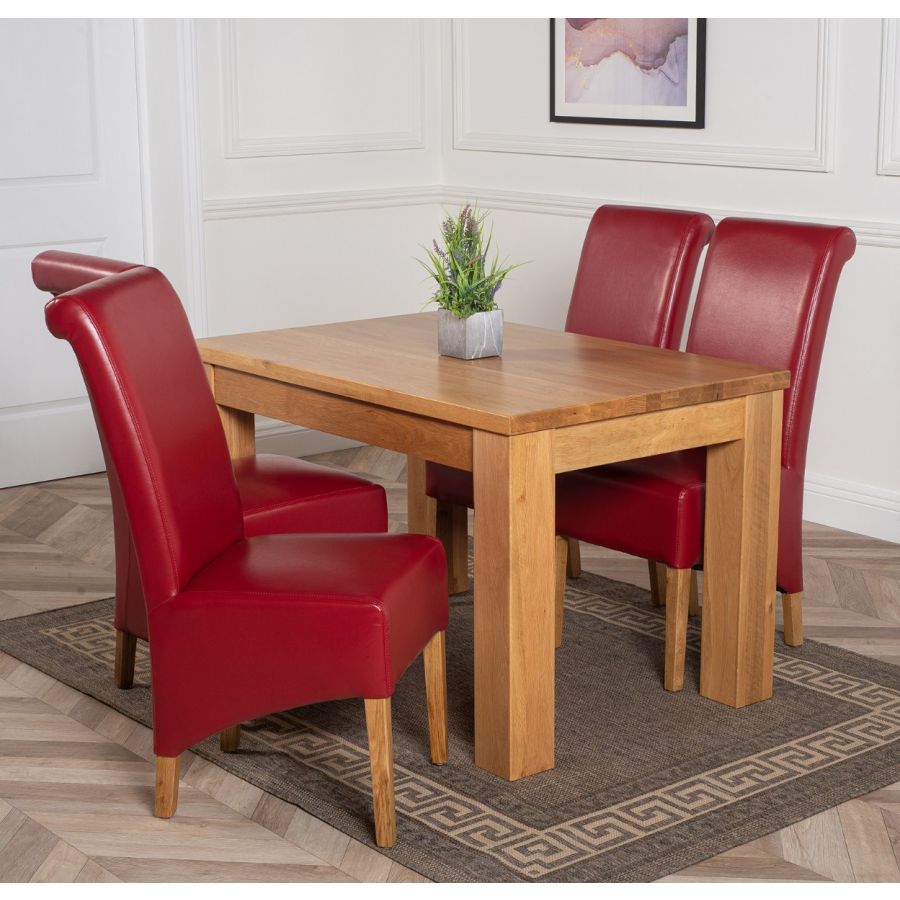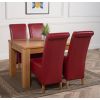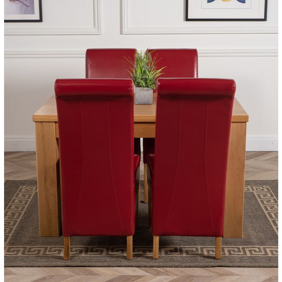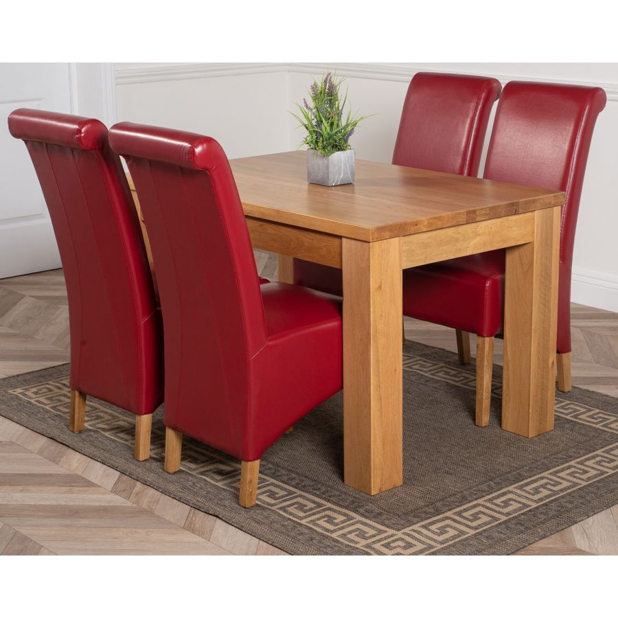 This dinner table and chairs set comes with 4 Montana dining chairs upholstered in burgundy bonded leather with oak legs, hardwood frames and sprung seats for exceptional comfort and durability.