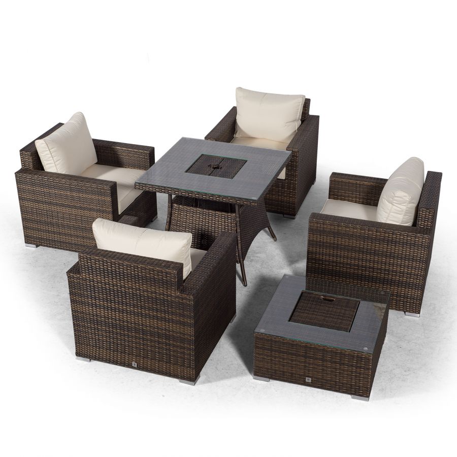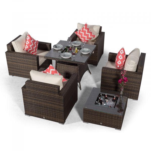 Relax and dine in style with the 4 seater Sydney drinks cooler outdoor conversation dining set. Consisting of 4 individual high back armchairs, a 90 x 90cm drinks cooler dining table and a drinks cooler coffee table, the Sydney collection features high backrests, luxuriously plump multi-density cushions and is available in a beautifully contrasting mixed brown weave or the equally stunning mixed grey weave.
