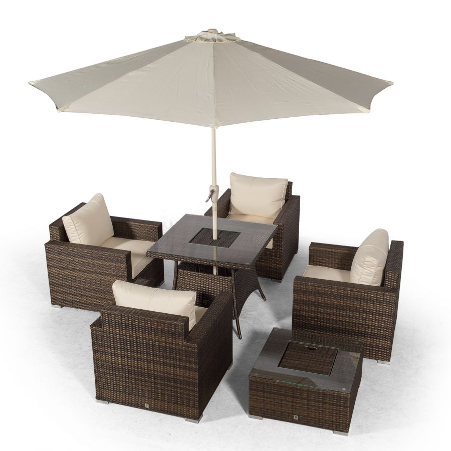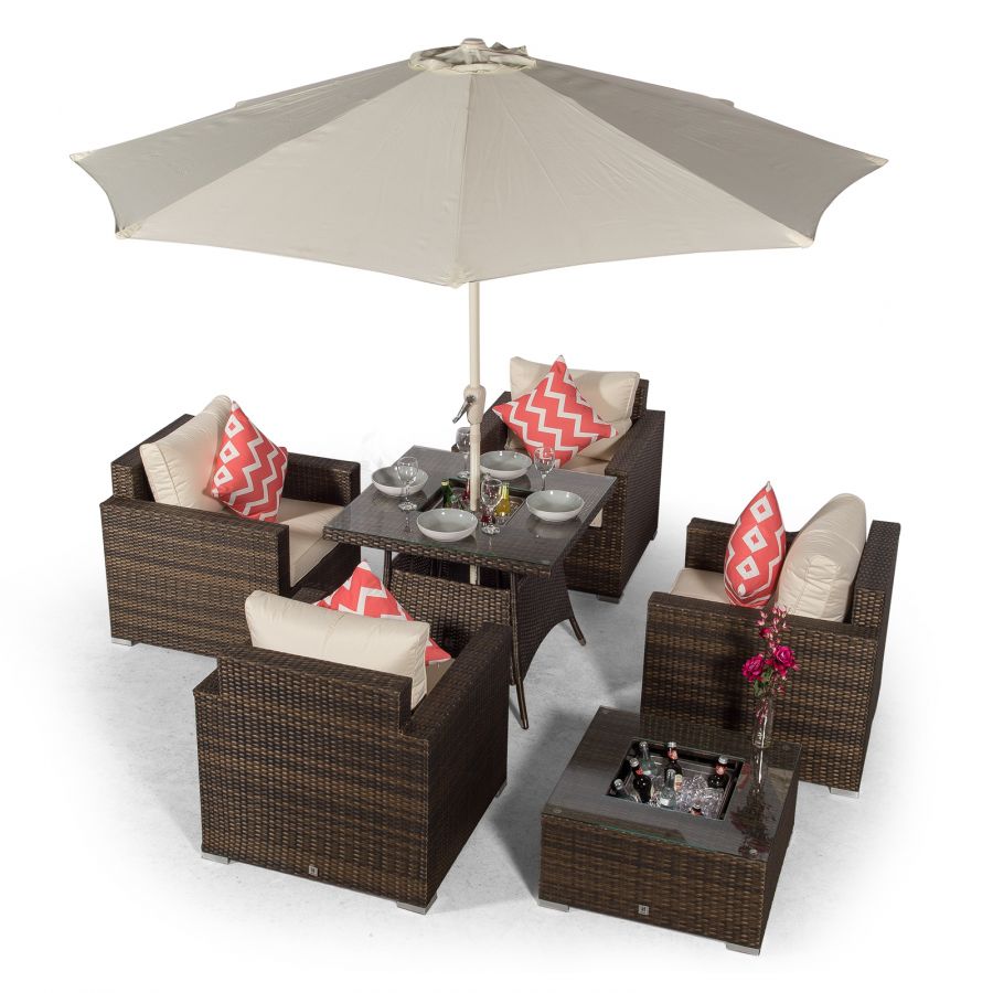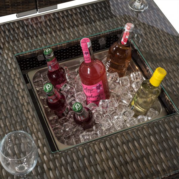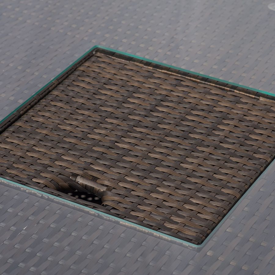 The dining table and coffee table both feature built-in drinks coolers, providing the perfect setting for alfresco family meals. Simply fill with ice and enjoy chilled drinks all day long, great for hosting parties and barbeques. The dining table comes complete with a 2.5m parasol with wind up crank mechanism and parasol base.