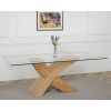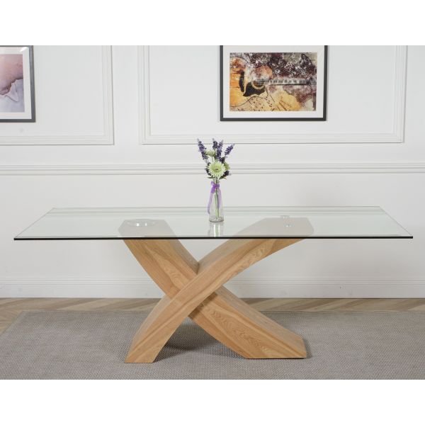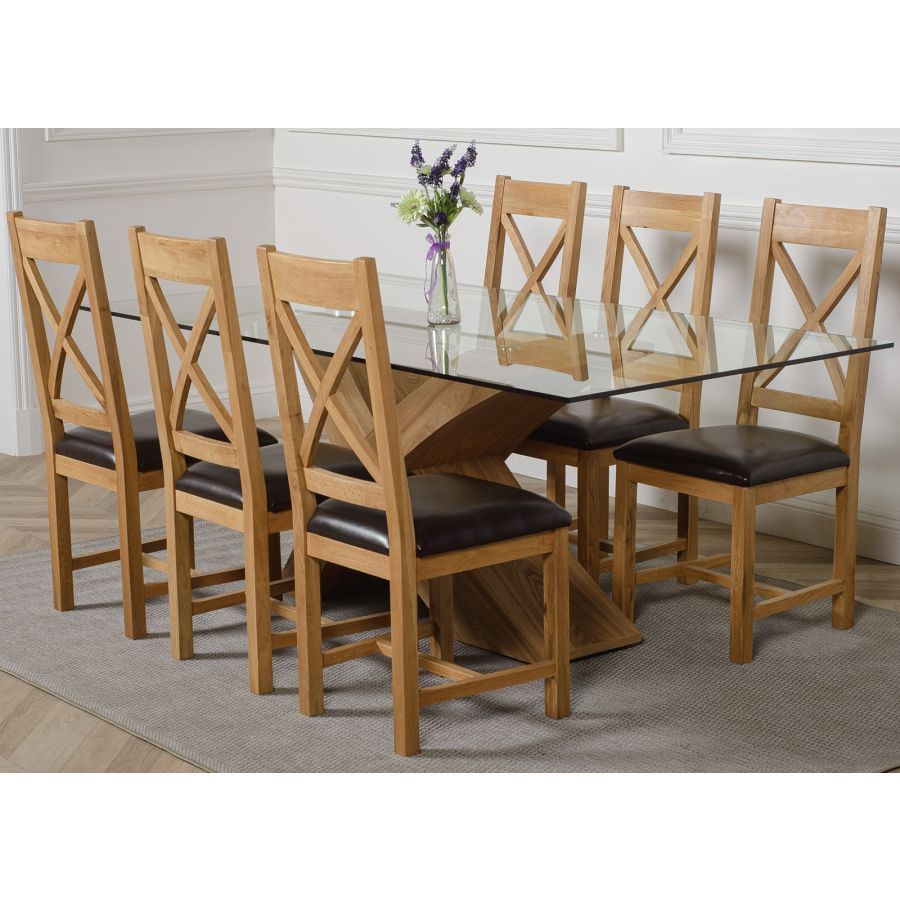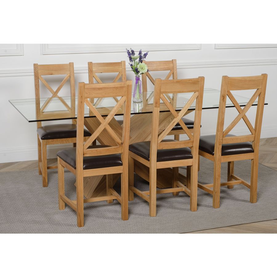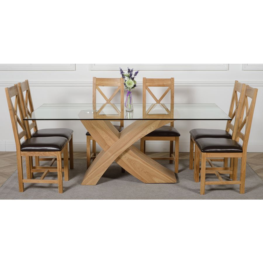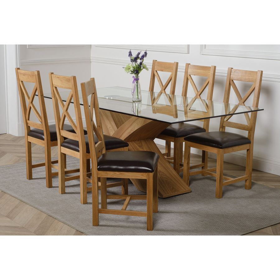 The Valencia large dining table and 6 chairs dining set is a stylish combination of glass and wood, crafted from 12mm thick tempered glass with a striking X shaped base made with real wood veneer finished in a natural oak colour. Combined with the comfortable Berkeley oak chairs this versatile dining table set will be the focal point of any kitchen or dining room setting.