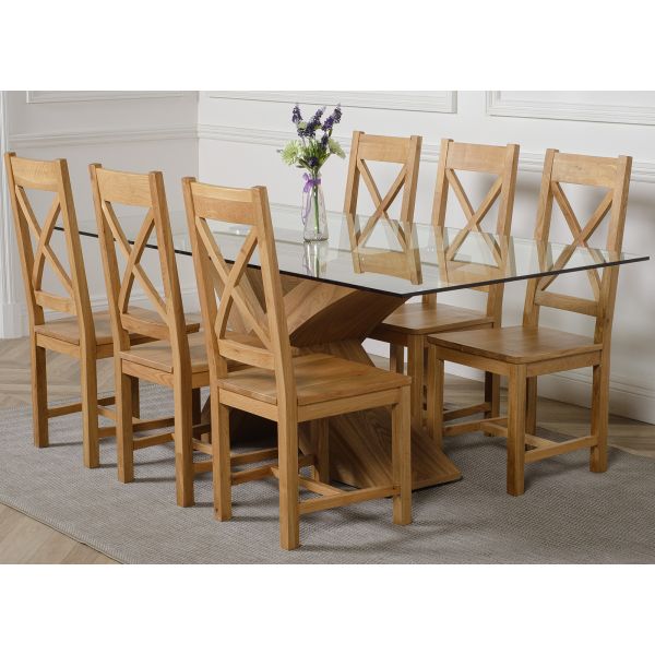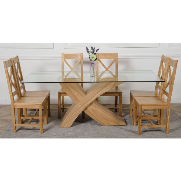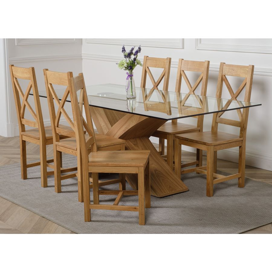 The Valencia large dining table and 6 chairs dining set is a stylish combination of glass and wood, crafted from 12mm thick tempered glass with a striking X shaped base made with real wood veneer finished in a natural oak colour. Combined with the comfortable Berkeley oak chairs this versatile dining table set will be the focal point of any kitchen or dining room setting.