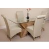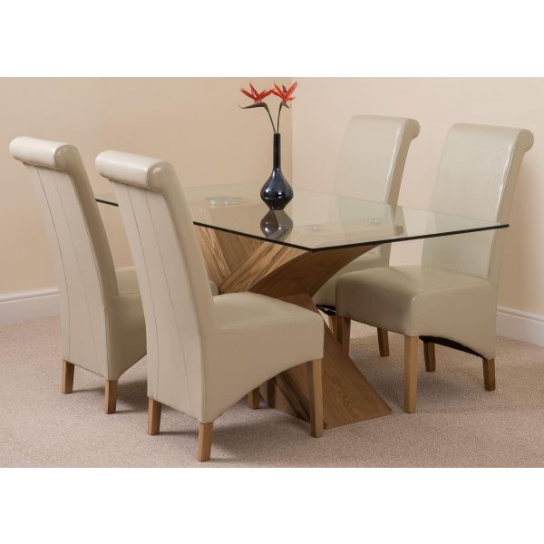 The Valencia glass dining table and 4 chairs dining set is a stylish combination of glass and wood, crafted from 12mm thick tempered glass with a striking X shaped base made with real wood veneer finished in a natural oak colour. Combined with the comfortable Montana dining chairs this versatile dining table set will be the focal point of any kitchen or dining room setting.